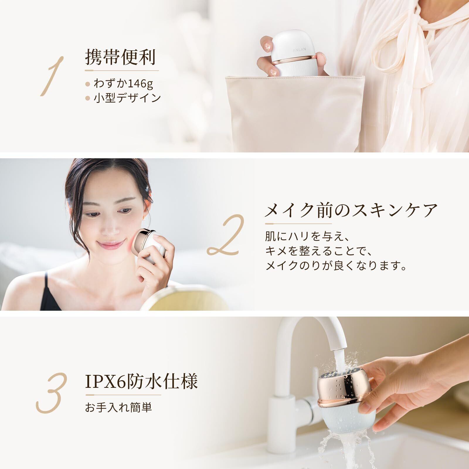 【IPX6防水仕様&超軽量コンパクト設計】 使用後のお手入れも水で簡単に洗い流せるため衛生的です。わずか146gという超軽量かつ小型のデザインは、持ち運びにも大変便利。旅行や出張先でも手軽に本格的なエイジングケアが可能です。また、場所を取らないため、ドレッサーの隅にもスマートに収納できます。いつでもどこでも、あなたの美容ルーティンをサポートします。