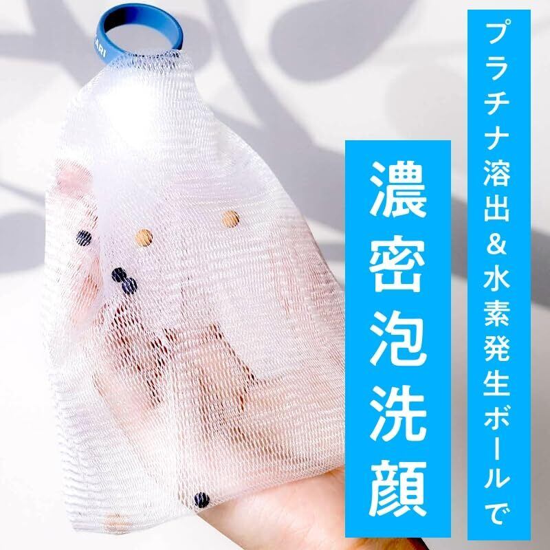 【水素を閉じ込める濃密泡立てネット】きめ細かいもっちり弾力泡で毛穴スッキリ!①水素発生ボール:水が触れるたびに水素を発生させ、泡に閉じ込めます。②プラチナ溶出ボール:プラチナが溶け出し、プラチナをまとった泡を生み出します。