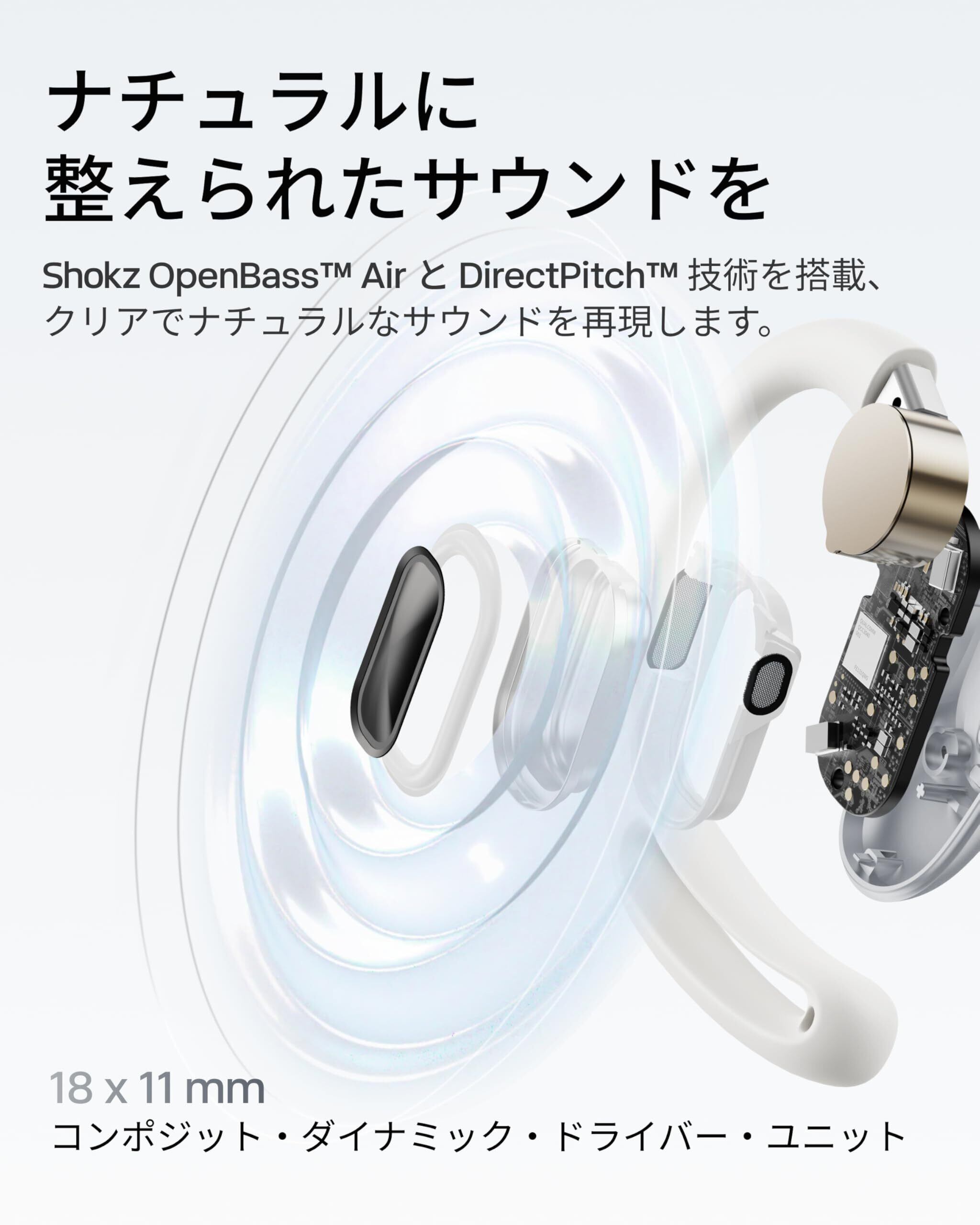 ナチュラルに整えられたサウンドを:当社独自のDirectPitch技術、Shokz OpenBass Air技術、18x11mmの大型ドライバーにより、オープンイヤー型でも高音質を実現し、ながら聴きに最適。単にバランスが取れているというだけでなく、音漏れを抑えてオーディオを正確にキープ。さらに、Shokzアプリの4つのプリセットEQモードでサウンドを自分好みに調整可能。