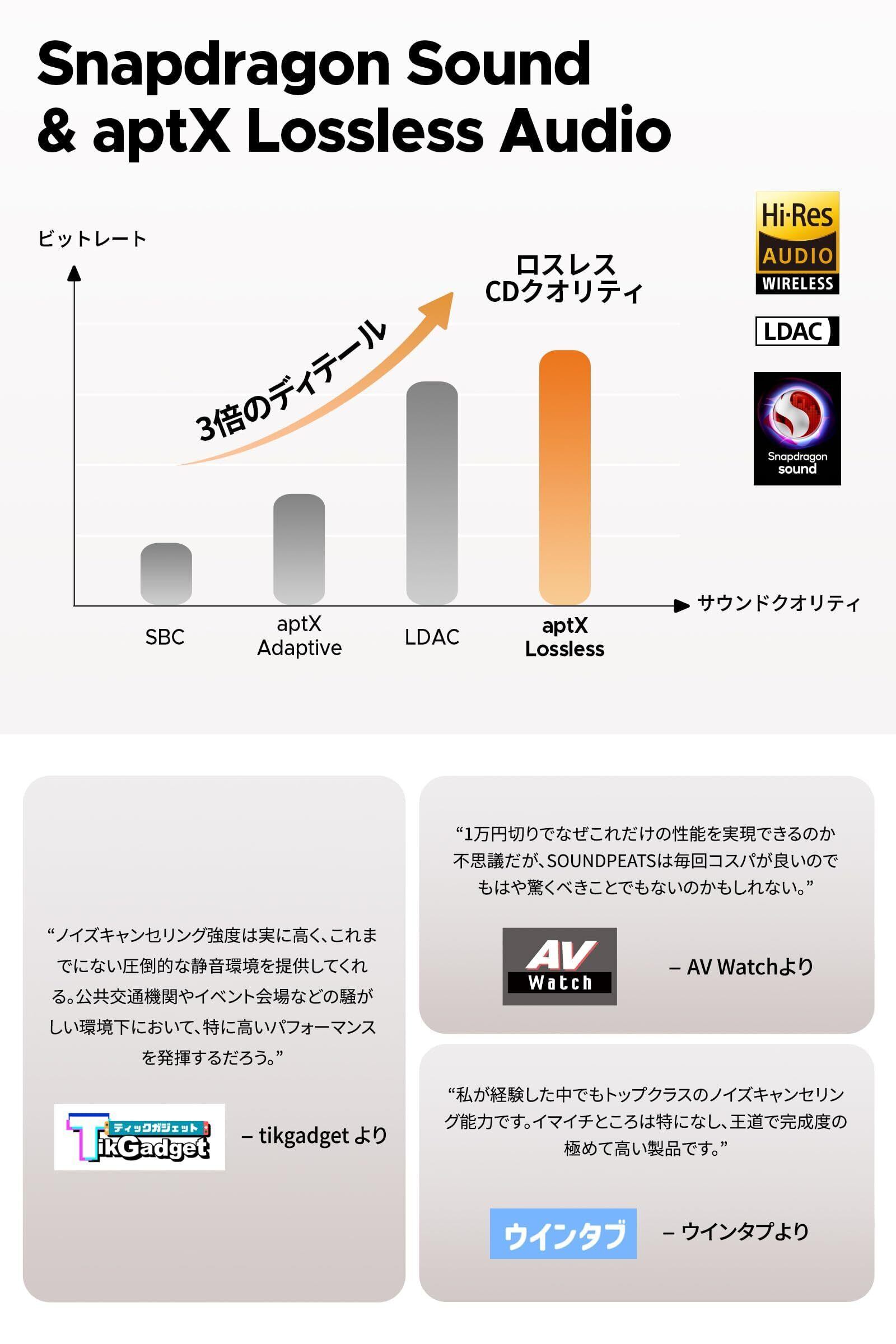 【至高のオーディオ体験は次のステージへ~LDAC※/aptX Losslessに両対応】※1「PeatsAudio」アプリにてマルチポイント機能をオフにすると、LDACコーデックをご利用いただけます。 ※2 マルチポイント接続時にLDACは利用できません。SOUNDPEATS Air5 Pro 完全ワイヤレスイヤホン は、Qualcommの最新世代チップ「QCC3091」を採用、最大96kHz/24bitのハイレゾワイヤレス再生が可能なLDACとaptX Adaptive、そしてCD品質のオーディオデータを損失なく伝送できるaptX Losslessに対応しました。楽曲の細部までクリアに再現し、スタジオクオリティのサウンドをお楽しみいただけます。さらに、環境に応じて最適なコーデックを自分で選択できるため、ワイヤレスでも妥協のない音楽体験を実現。音の違いにこだわるあなたへ、至高のオーディオ体験をお届けします!
