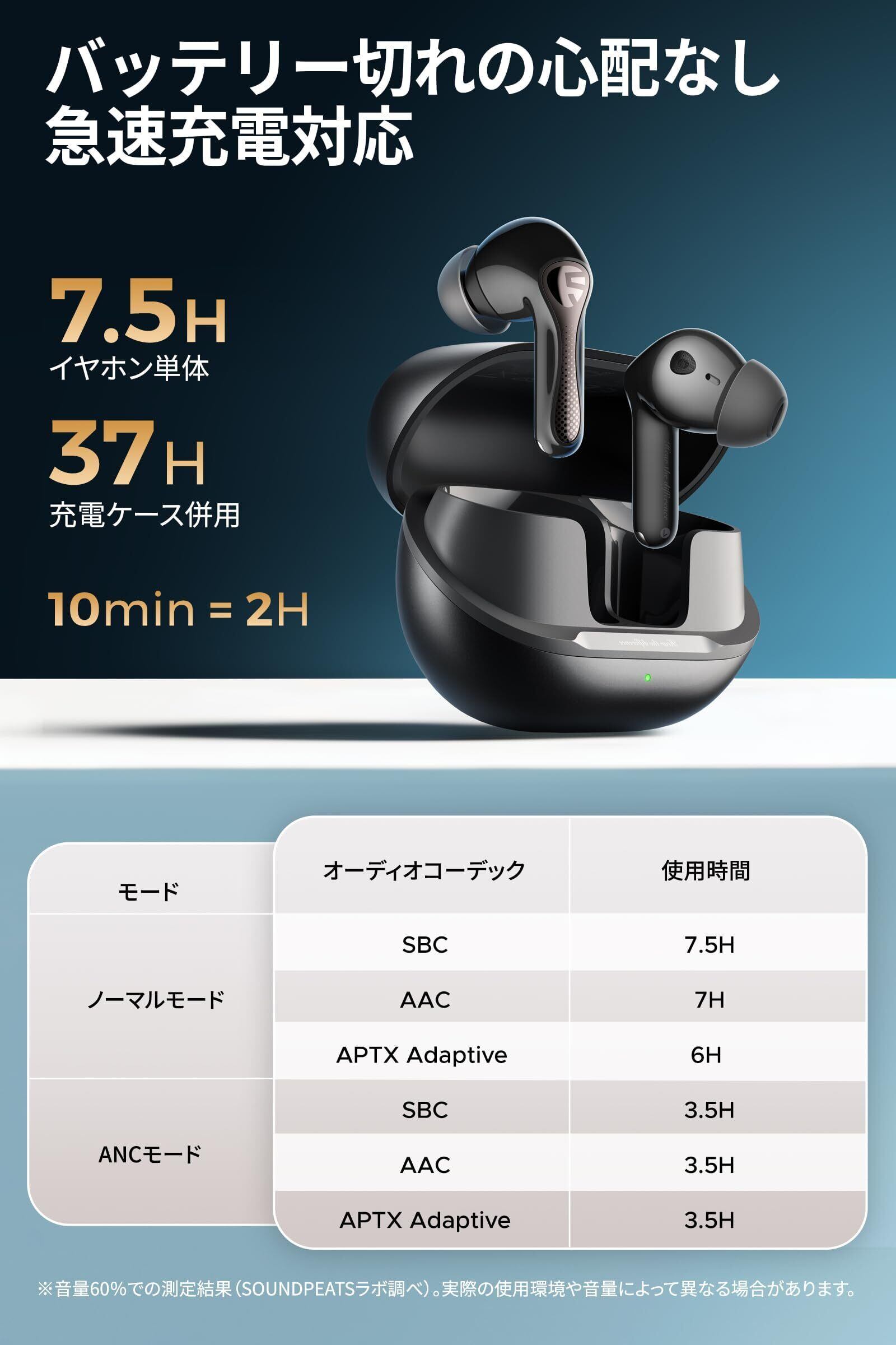 【バッテリー切れの心配なし!最大37時間再生可能&急速充電対応】イヤホン単体で7.5時間の連続再生が可能※。充電ケースを併用すれば合計37時間もの長時間バッテリーライフを実現します。さらに、急速充電に対応しており、わずか10分の充電で2時間の再生が可能です。長時間の音楽鑑賞はもちろん、外出先での急なバッテリー切れの心配もこれで解決。快適なサウンド体験を、どこでも存分にお楽しみいただけます。また、イヤホンはIPX5の防水性能を備えており、アウトドアやスポーツシーンでも安心してご利用いただける快適な音楽体験をお届けします!※(AACコーデック、音量60%、通常モード、ANC OFFで測定)再生時間は音楽再生時の時間であり、音量、再生内容、使用環境によって異なる場合があります。