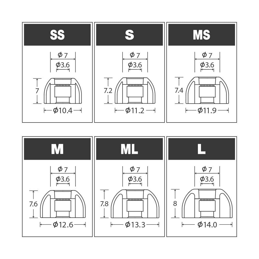 【より多くの方にベストフィッティングさせる6サイズ展開】SednaEarfit XELASTEC IIは、一般サイズのStandardタイプを採用しています。中間サイズを含めたSS/S/MS/M/ML/Lの計6サイズで、より多くの方にフィッティングしやすくしています。また、パッケージング構成は、単品サイズ2ペアと、非常に好評な中間サイズを含めた近接3サイズ(例:S/MS/M)を1ペアずつパッケージングした3ペアの2種類を採用。これにより、左右で耳道の大きさが異なるなどの際、微妙な調整をしやすくなります。さらに最もユーザーニーズが高かった近隣3サイズのMサイズクラスは、MとMSそれぞれを中心にした2タイプのセット商品をご用意し、より選択しやすいようにしました。