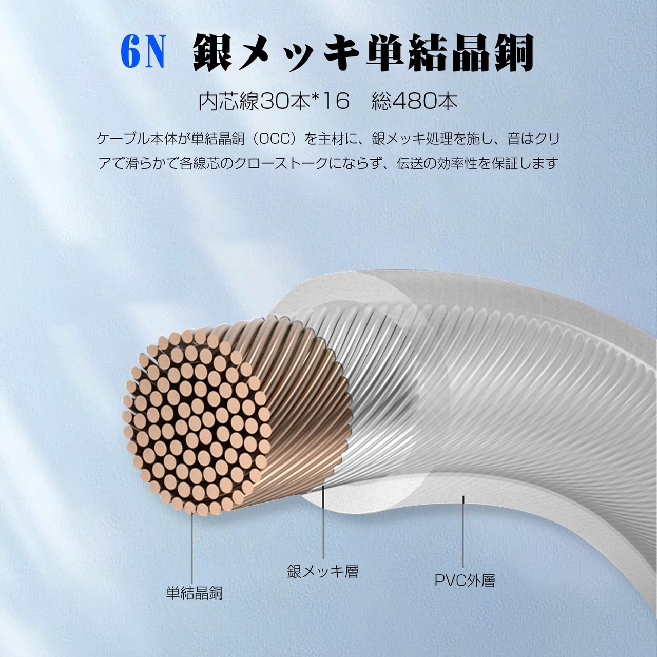 「 6N 銀メッキ単結晶銅素材 」ケーブル本体が単結晶銅(OCC)を主材に、銀メッキ処理を施し、三音域のバランスが取れており、深みのあるしっかりとした低音、クリアな中音域、美しい高域を備えています。