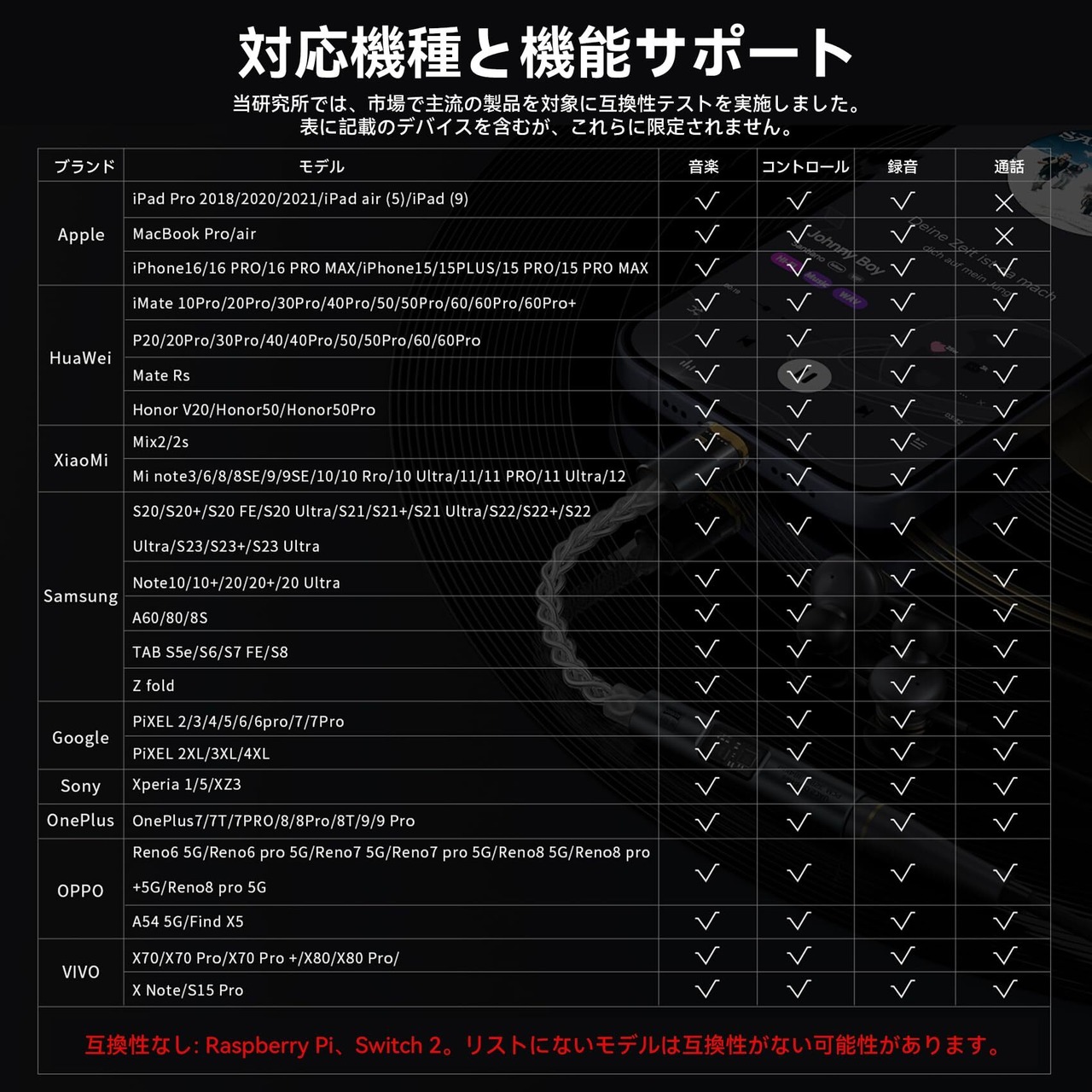 ▲【幅広い互換性&インライン制御】 USB-C端子とUSB-A変換アダプターを装備し、Androidスマートフォン、iPad Pro、MacBook、Windowsノートパソコンに対応し、即座に接続可能です。当研究所では、市場で主流の製品を対象に互換性テストを実施しました。 図表に記載のデバイスを含むが、これらに限定されません。CCZ CM01 3.5mm 変換 タイプcは接続された3.5mmイヤホン/ヘッドホンのインラインボタン機能(再生/一時停止、音量調節、通話着信、曲切り替え等)を信号ロスなしで伝達。