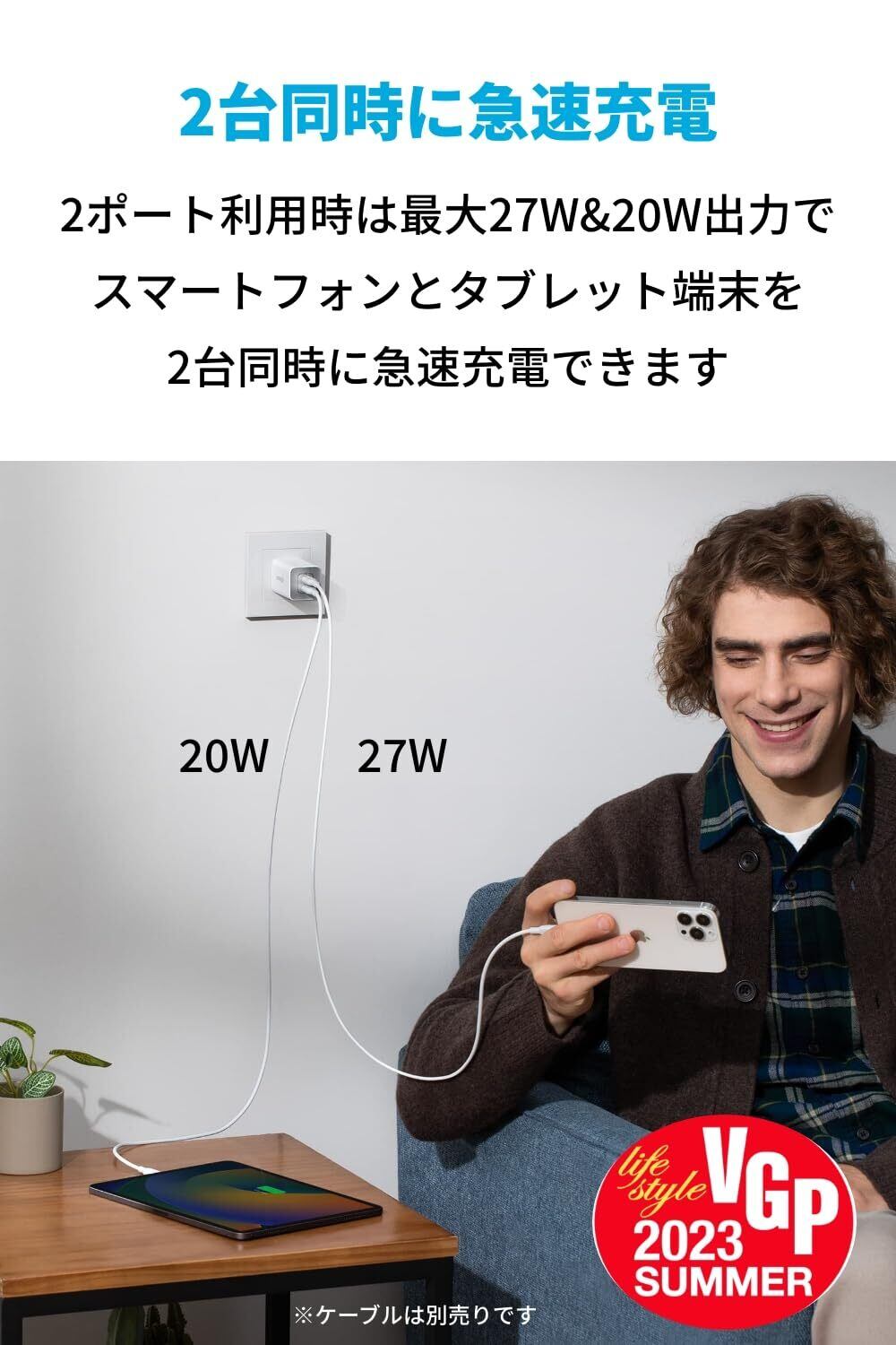 2台同時急速充電:USB PD対応の2つのポートを搭載し、2ポート利用時にも最大27W&20W出力が可能。スマートフォンやタブレットなど、2台のデバイスを同時に充電することができます。