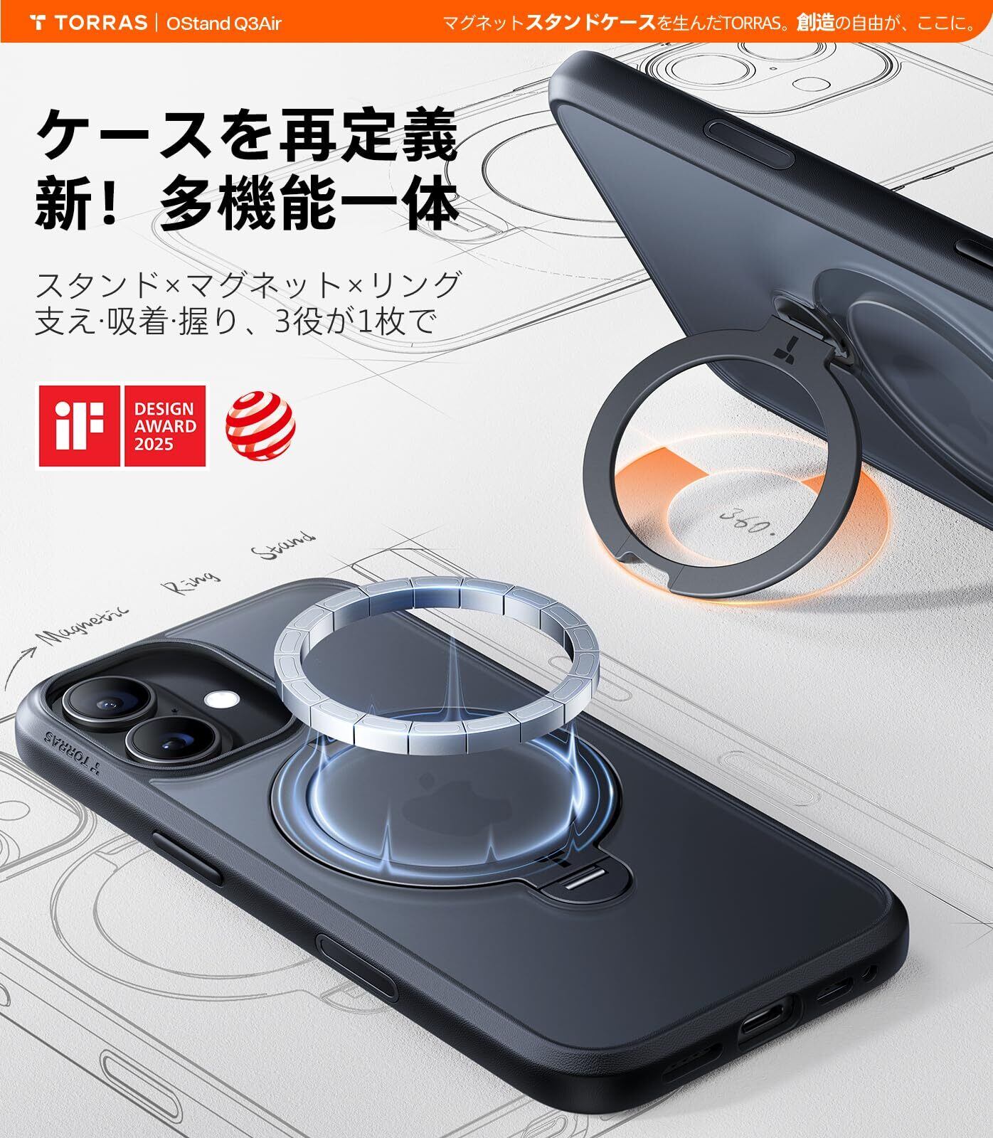【在庫処分】TORRAS iPhone 17 用 ケース【多機能一体・360°新定点回転スタンド】 Magsafe対応 カメラコントロールボタン 高耐久性 耐衝撃 ゼンマイ式スタンド リング 縦横両対応 マグネット搭載 急速充電対応 指紋防止「Ostand Q3 Spin」ブラック