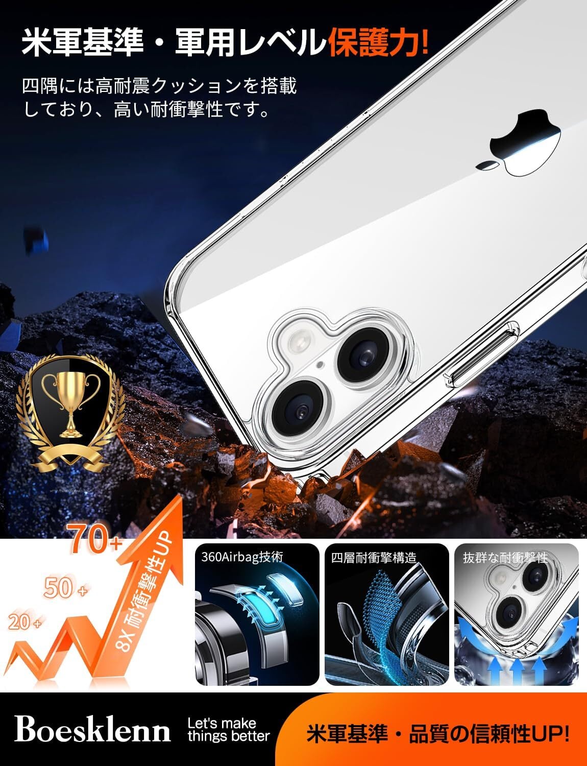 【Boesklenn】対応 iPhone 17 ケース クリア 耐衝撃 MIL規格 軍用認証 高光沢 黄変防止 SGSテスト済み ワイヤレス充電可能 軽量 スリム設計 衝撃吸収 TPU+PC強化 対応 いphone17 透明ケース (6.3インチ)