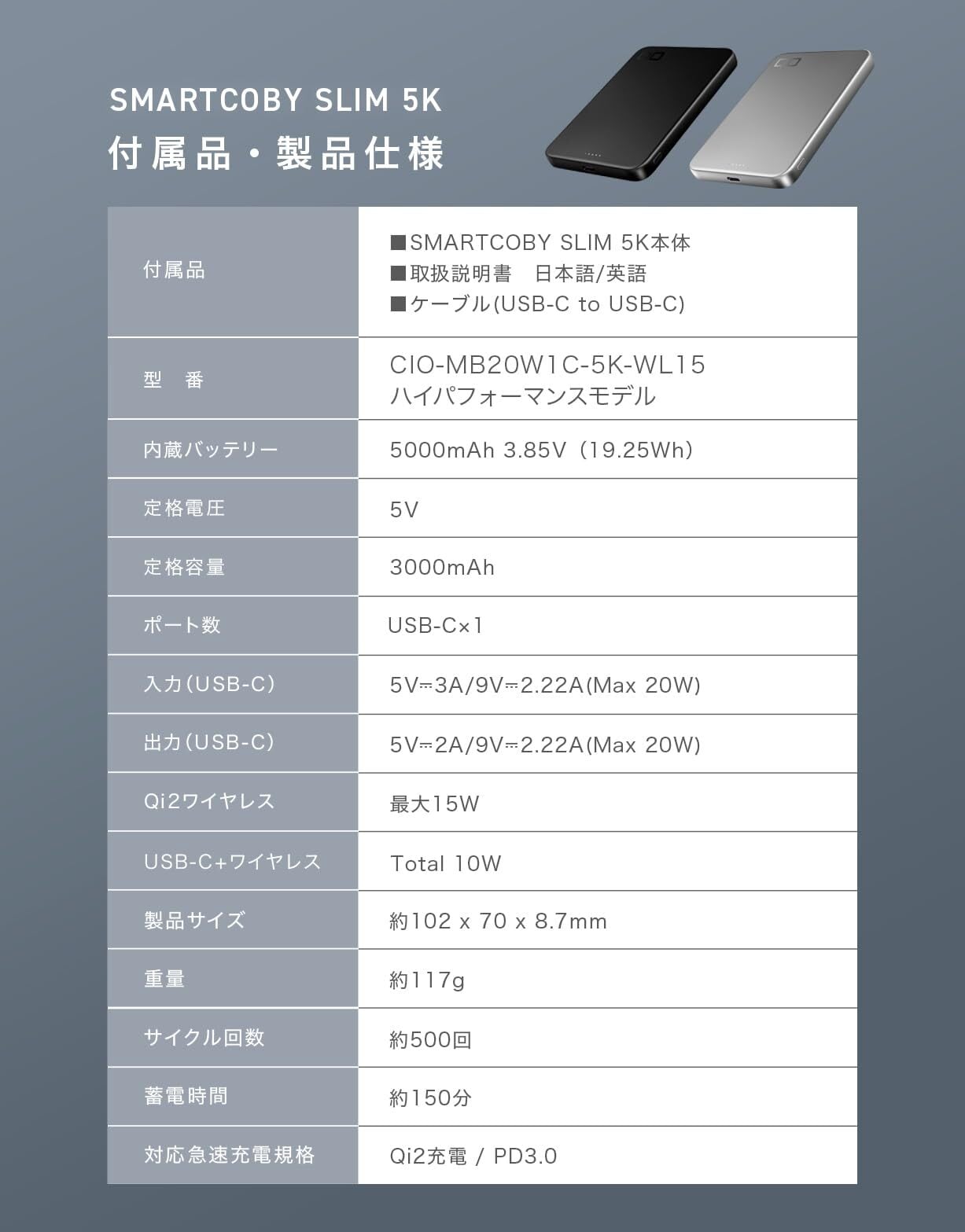 CIO Qi2 MagSafe対応 5000mAh 充電速度優先 モバイルバッテリー 超薄型 [薄さ8.7mm] マグネット ワイヤレス充電 軽量 小型 USB-C PD 20W iPhone 17 / 16 / 15 / 14 / 13 / 12 / Airシリーズ Pixel10シリーズ に対応 急速充電 SMARTCOBY SLIM 5K (シルバー, ハイパフォーマンスモデル)