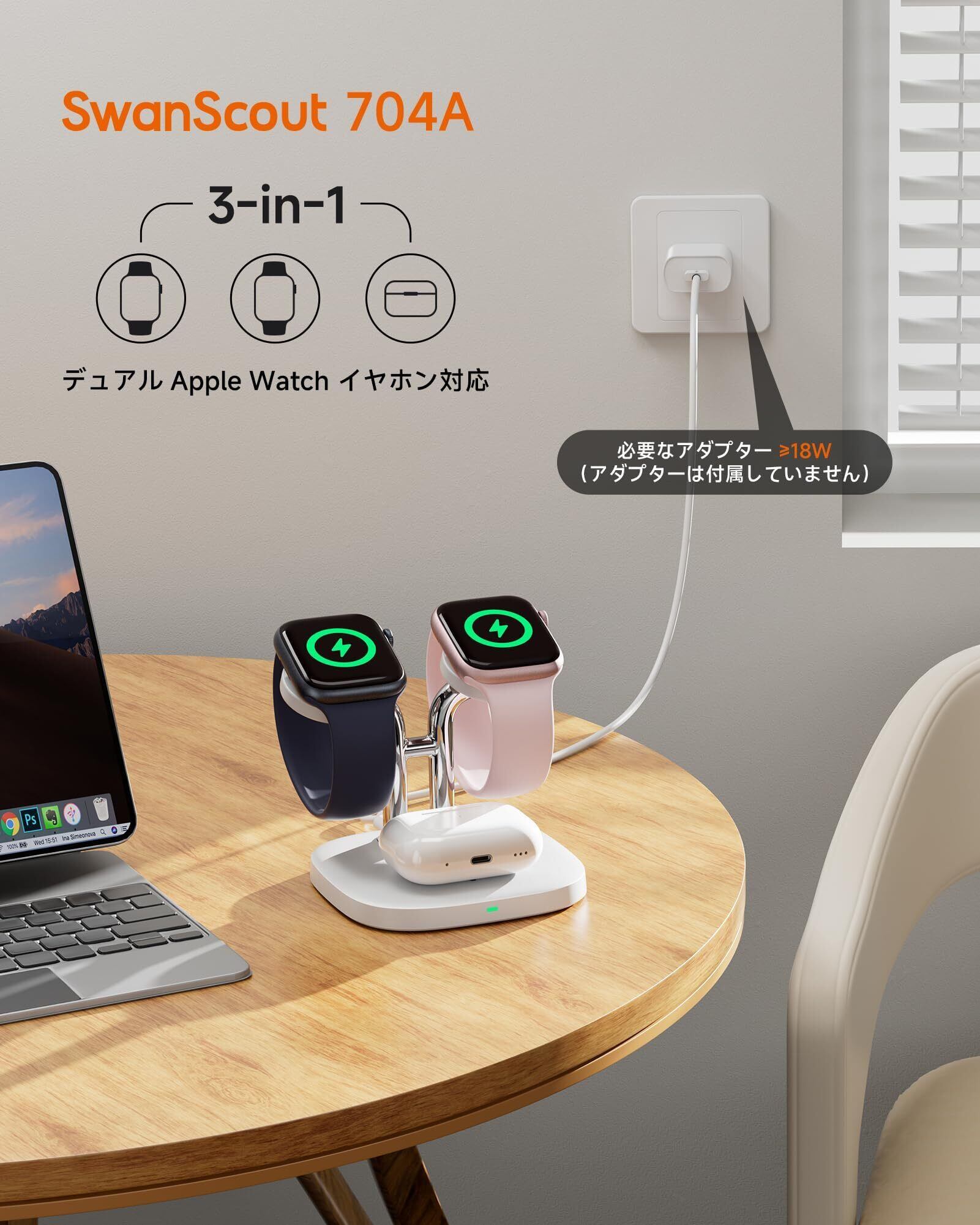 アップルウォッチ 充電器 スタンド 2台同時、Apple Watch対応 急速充電器、Apple Watch 11/10/9/8/7/6/5/4/3/2、Ultra 3/Ultra 2/Ultra/SE 3/SE 2/SE対応、SwanScout 704A (ホワイト)