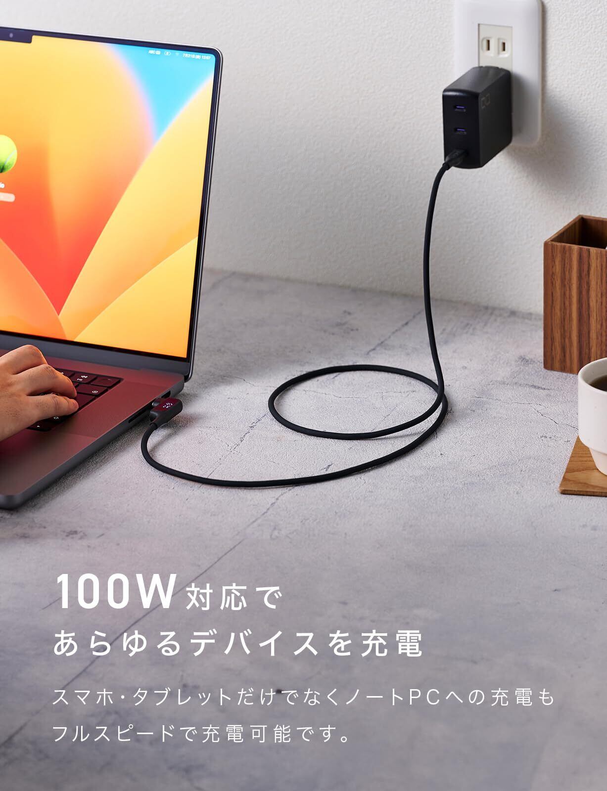 【PD 急速充電 100W 対応で様々な機器を安定して充電】100Wの大出力やUSB-PDにも対応するケーブルを採用しているので、スマホだけではなく、ノートPC (MacBook air M3 / Surface / Lenovo など)もらくらく充電可能。※100W急速充電には100W出力以上に対応したACアダプタが必要となります。お持ちでない方はCIOが販売する充電器がおすすめです。