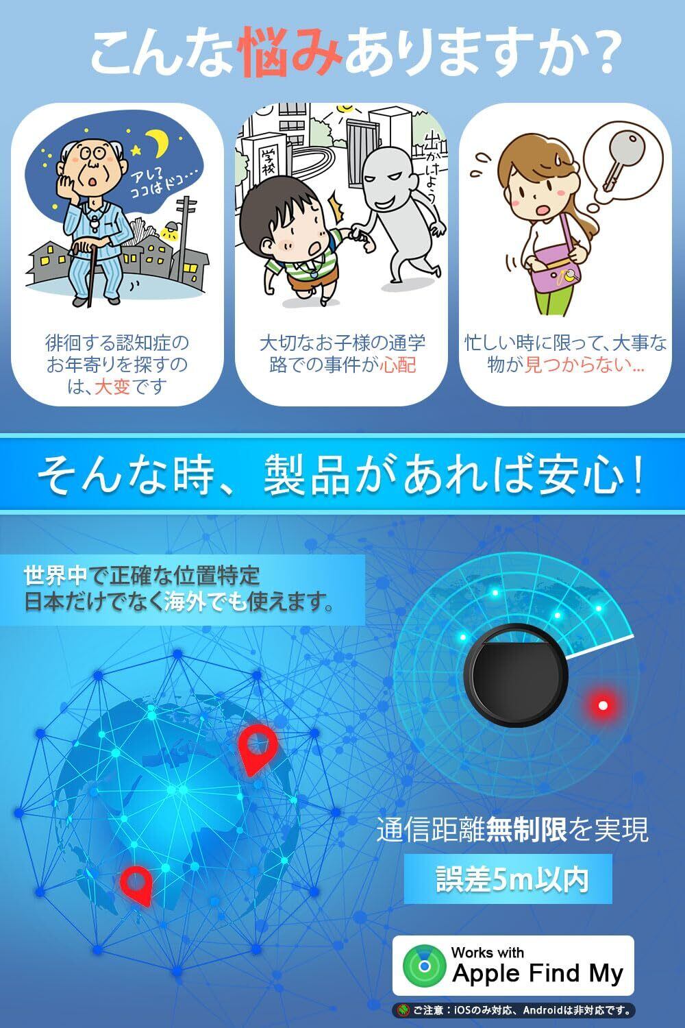 【色々なシーンで大活躍】物忘れ易いな方、小物探しに苦手な方、又は物置の場所がすぐに分からなくなるな方にオススメ。キー/財布/鞄/荷物/ベビーカー等の紛失易い/大切な物に付けるだけでなく、子供や年寄りに付けば、簡単に位置情報が受けられます。【位置共有可能】airタグの位置は「探す」アプルから家族や友人と共有できます。iOS17では、最大5人と共有可能。大切な人たちと一緒に、安心して位置の把握!【防水性】生活防水性能を備えたスマートトラッカーは急な大雨や軽い水没などにも耐えられる仕様となりました。ハイキング、サイクリング、登山、犬の散歩、通勤などのアウトドア活動でも安心です。