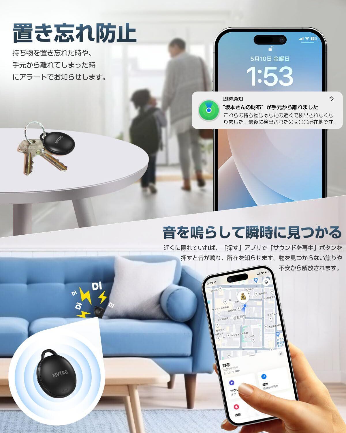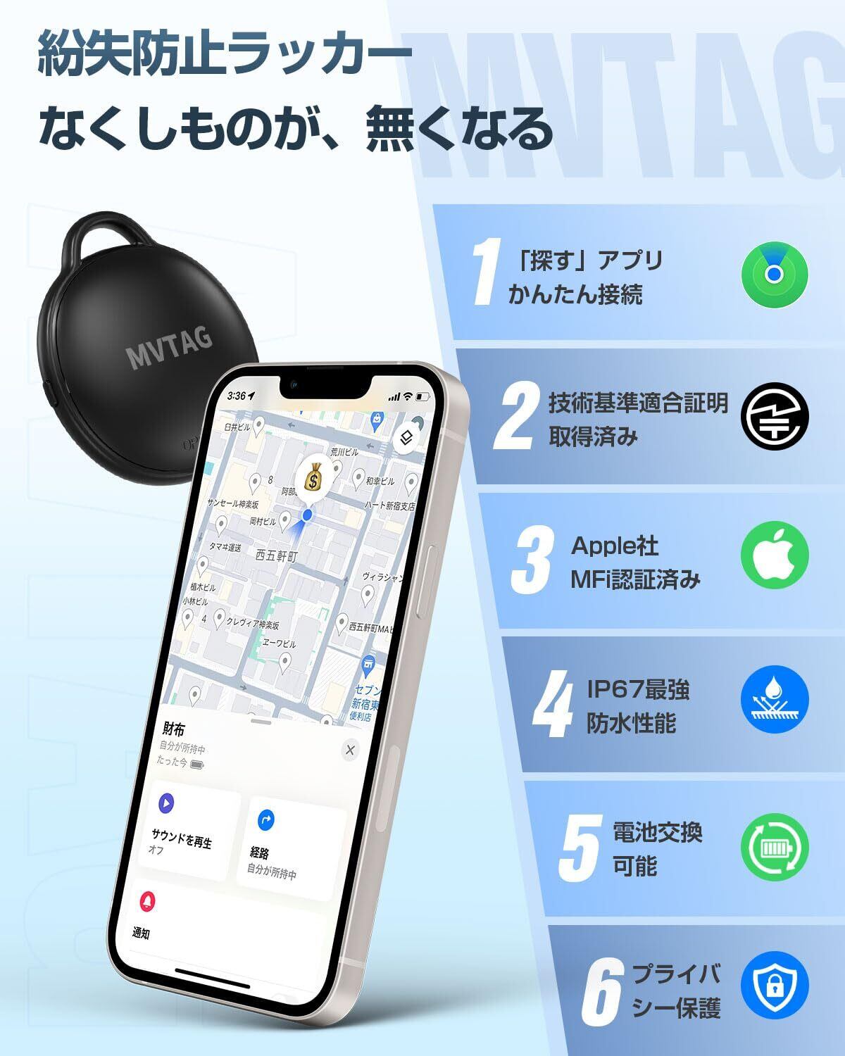 【スマートタグ & 紛失防止タグ】スマートタグとは、カバン、鍵や財布、自転車やバイクなどに取り付けて、音で物を探したり、置き忘れを防止したり、なくしたときにその現在情報を取得できる忘れ物防止 タグ/紛失防止タグです。スマートフォンに接続するだけで、物品の位置を迅速に特定できます。これより、失われた物品を探す時間と不安を大幅に減らすことができます。(※iOSのみ対応、Androidは対象外です。)【安心のApple MFi認証品 】の紛失防止タグはMFI認証済みで、Apple公式ウェブサイトのMFI認証の所で「MVTAG」を検索すれば認証済みの正規商品であることが分かります。【Appleの「探す」に対応】第三社のアプリのダウンロードは不要です。Appleの「探す」ネックワードにサポートされているため安定した接続が可能で、日本だけでなく世界中のどこでも使えます。