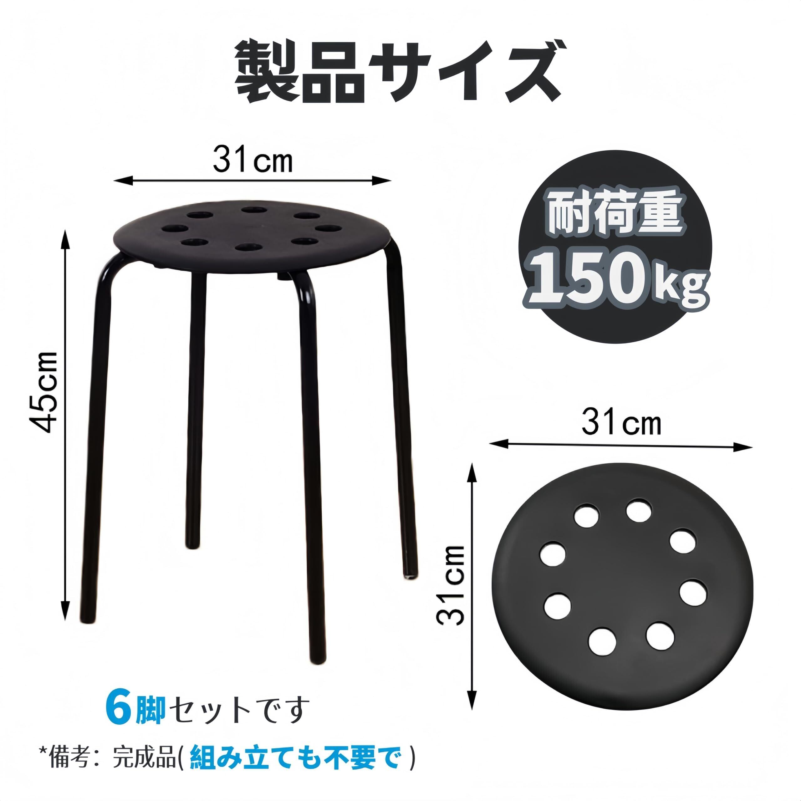 【商品仕様】素材:PP(ポリプロピレン)、鉄のフレーム。本体サイズ:座面直径 31cm、高さ 45 cm。耐荷重:最大150kg。梱包内容:丸椅子 6脚セット *備考:完成品(組立不要)