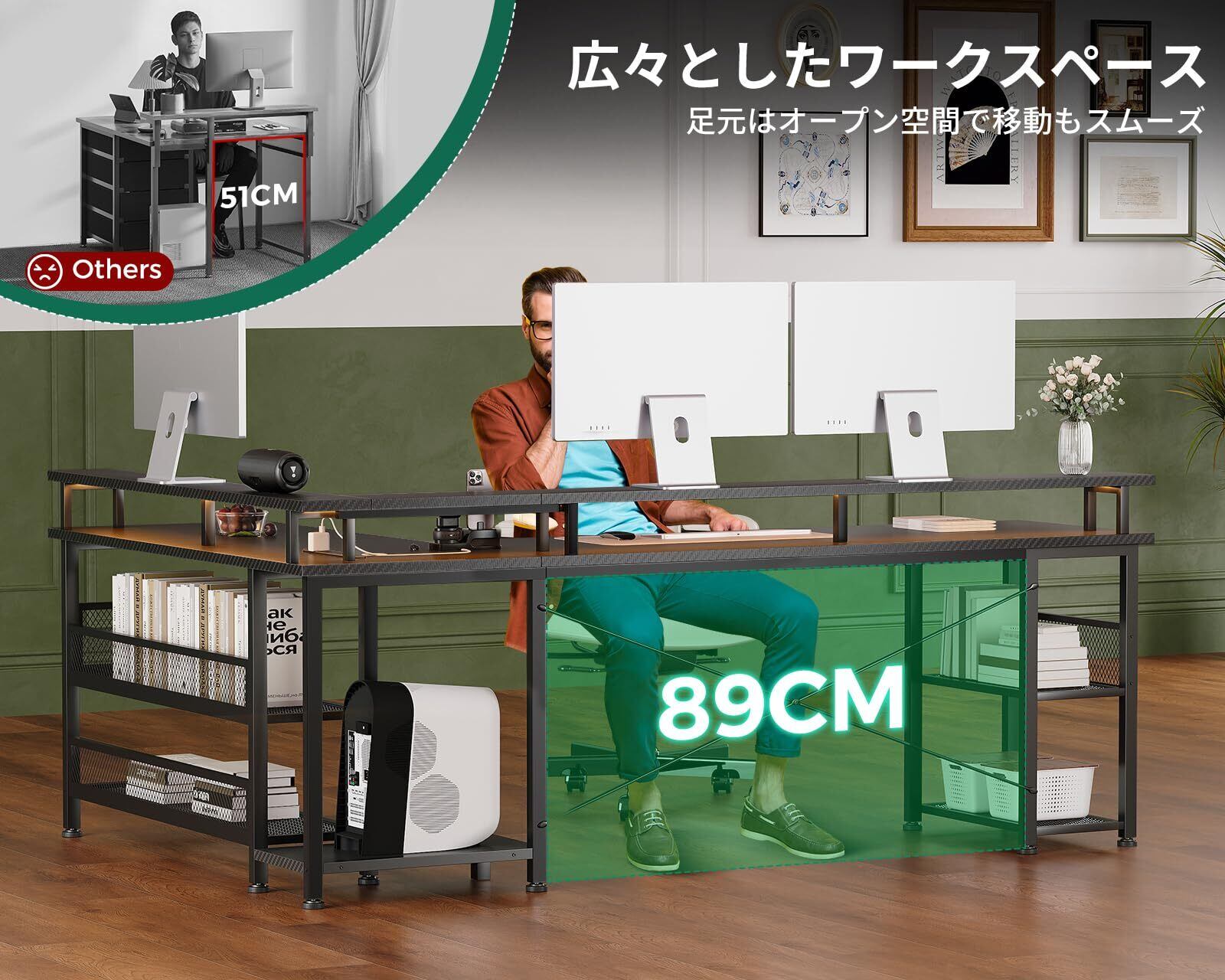 【ラック付きデスク・収納力満載】デスクの足元には一体型のラックが備え、本や書類などを使いたい時にサッと取り出せます。たっぷりの収納でデスク周りをスッキリ快適に!また、L字型のデザインで部屋のコーナーを最大限に活用でき、ご家庭でもオフィスでも、日常の仕事に十分なスペースを確保できます。