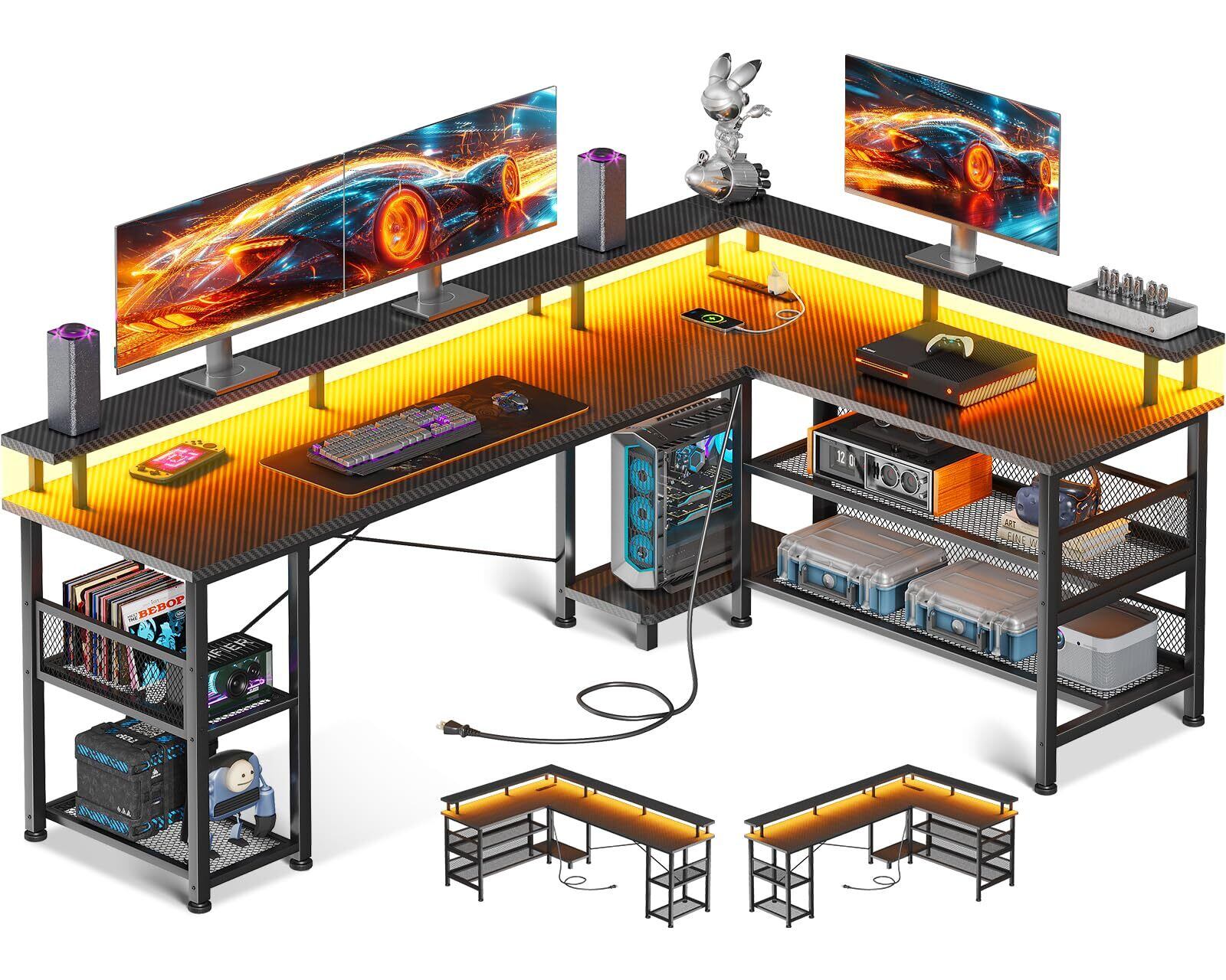 【数量限定】AODK ゲーミングデスク パソコンデスク コンセント l字デスク 机 pcデスク LEDライト 勉強机 棚付き オフィスデスク 幅168 ワークデスク 桌子 在宅勤務 事務机 組立簡単 カーボンブラック