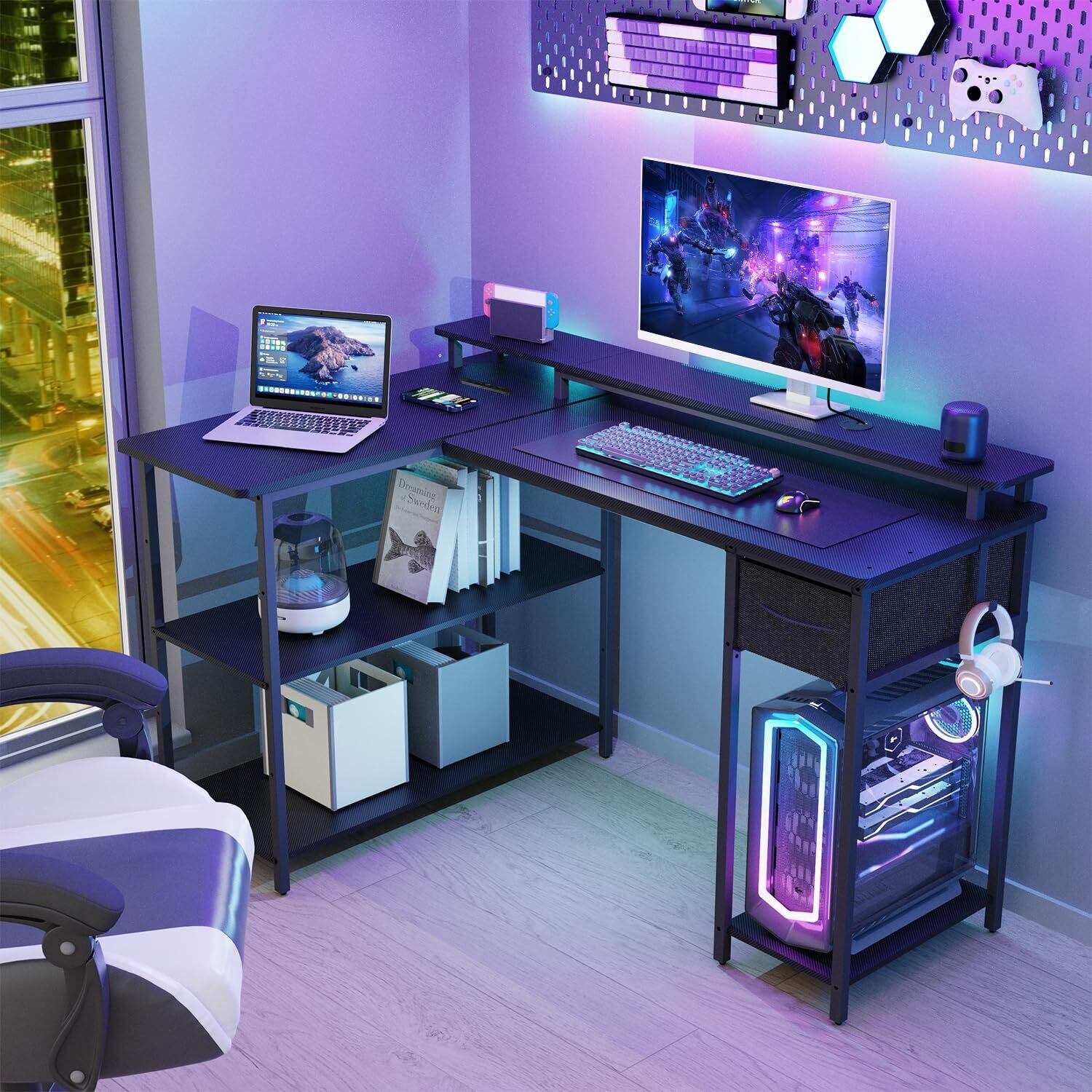 【特価セール】VARNIC ゲーミングデスク パソコンデスク L字型 左右組み替え可能 電源タップ付き 配線穴付き pcデスク オフィスデスク 127cm長さ*85cm奥行*75cm高さ モニター台付き 可動式棚板 引き出し付き 調整可能な脚 省スペース おしゃれ 勉強机 L字デスク 組み立て簡単 頑丈 学習デスク テレワーク リモートワーク ゲーミング | SmartLiving+