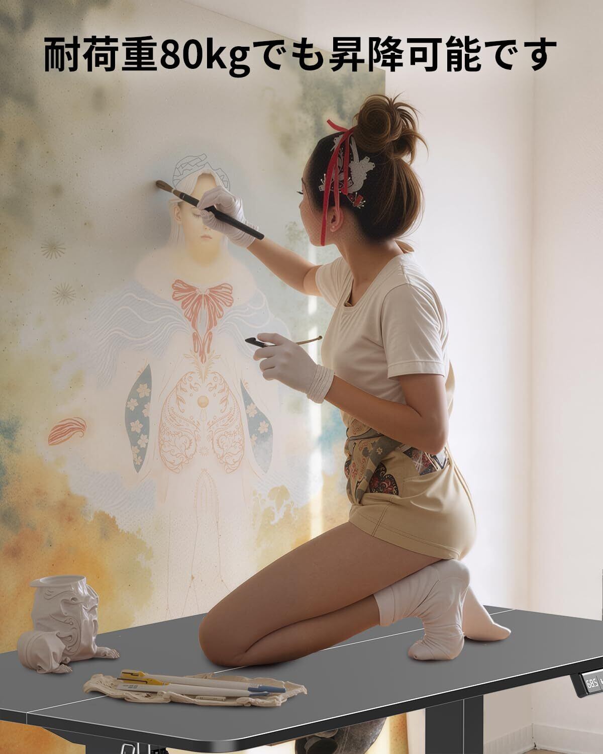 【静音設計&衝突検知でさらに安心】高性能モーターによるスムーズで静かな昇降動作は、深夜の作業やオフィスでも音を気にせず使用可能です。さらに、障害物を検知して自動停止する衝突感知センサーを搭載。不意の接触によるトラブルやケガを防ぎ、安全性もバッチリ。安心して日々の作業に集中できます。
