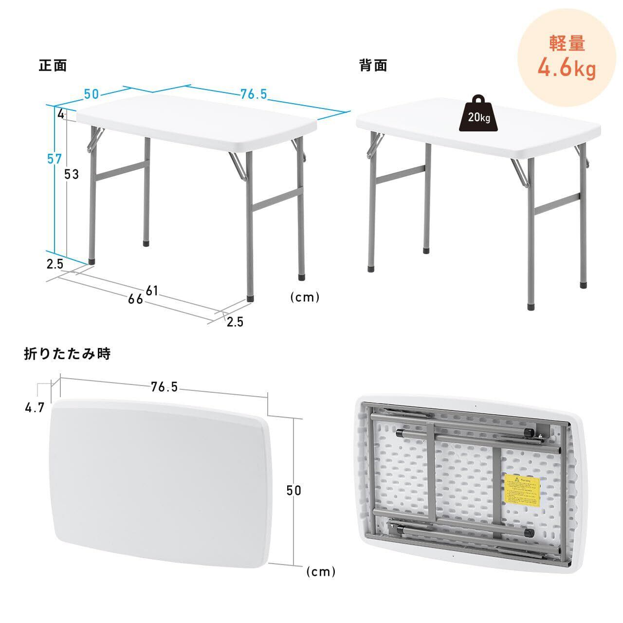 【新着商品】サンワダイレクト 折りたたみテーブル 幅76.5cm×奥行50cm×高さ57cm 耐荷重20㎏ 樹脂天板 軽量 4.6㎏ アウトドア ミニデスク ホワイト 100-FD024W