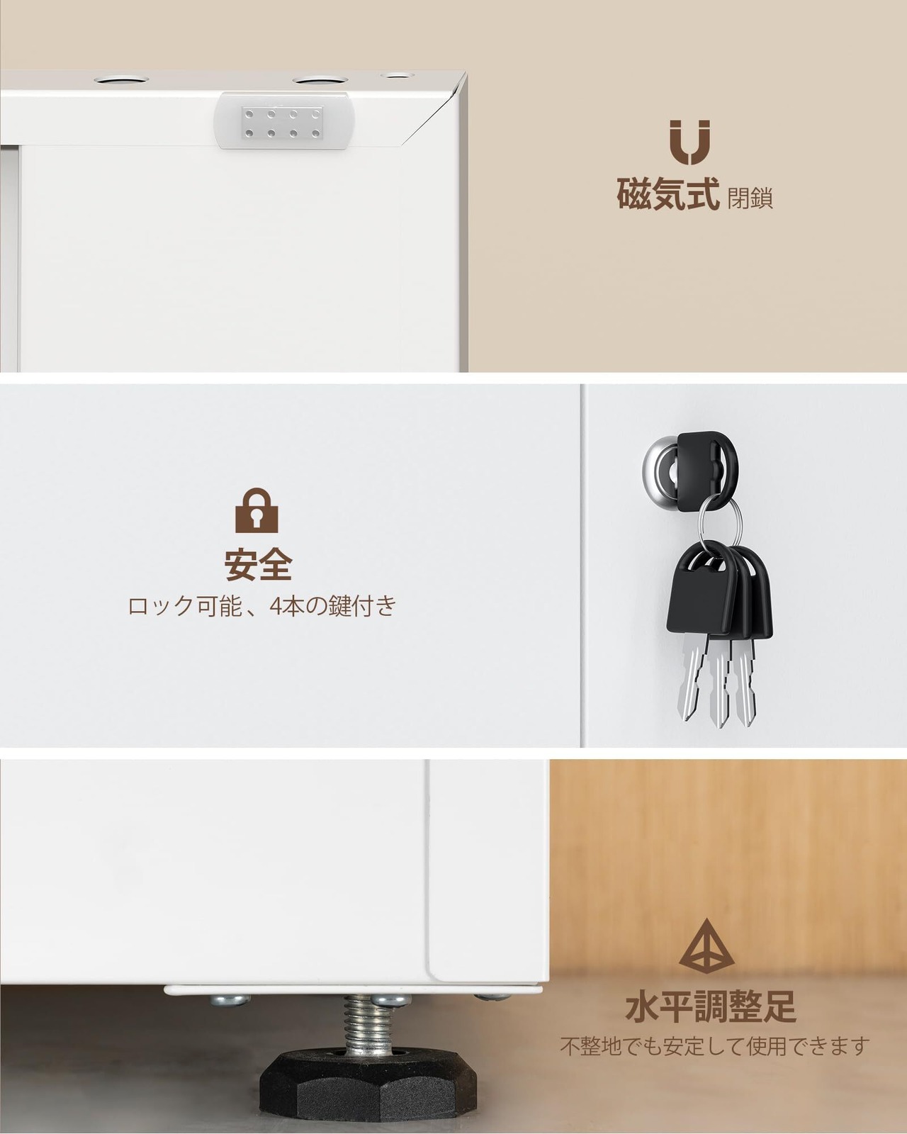 【セキュリティ強化】鍵付きキャビネットには鍵が4本付属。施錠時は重要書類や私物をしっかり保護します。さらに磁気閉じ機構でロックなしでも扉が自然に開く心配がありません。ロッカー 鍵付きとして子どもの手の届かない収納に最適です。