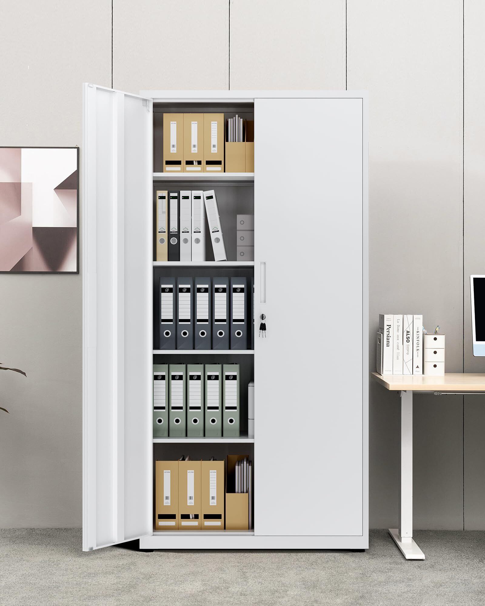 【特価商品】LAND·VOI スチールキャビネット 5段 鍵付き書庫 可動棚 両開き キャビネット収納 パントリー 幅80×奥行40×高さ181.5cm 組み立て必要 ホワイト