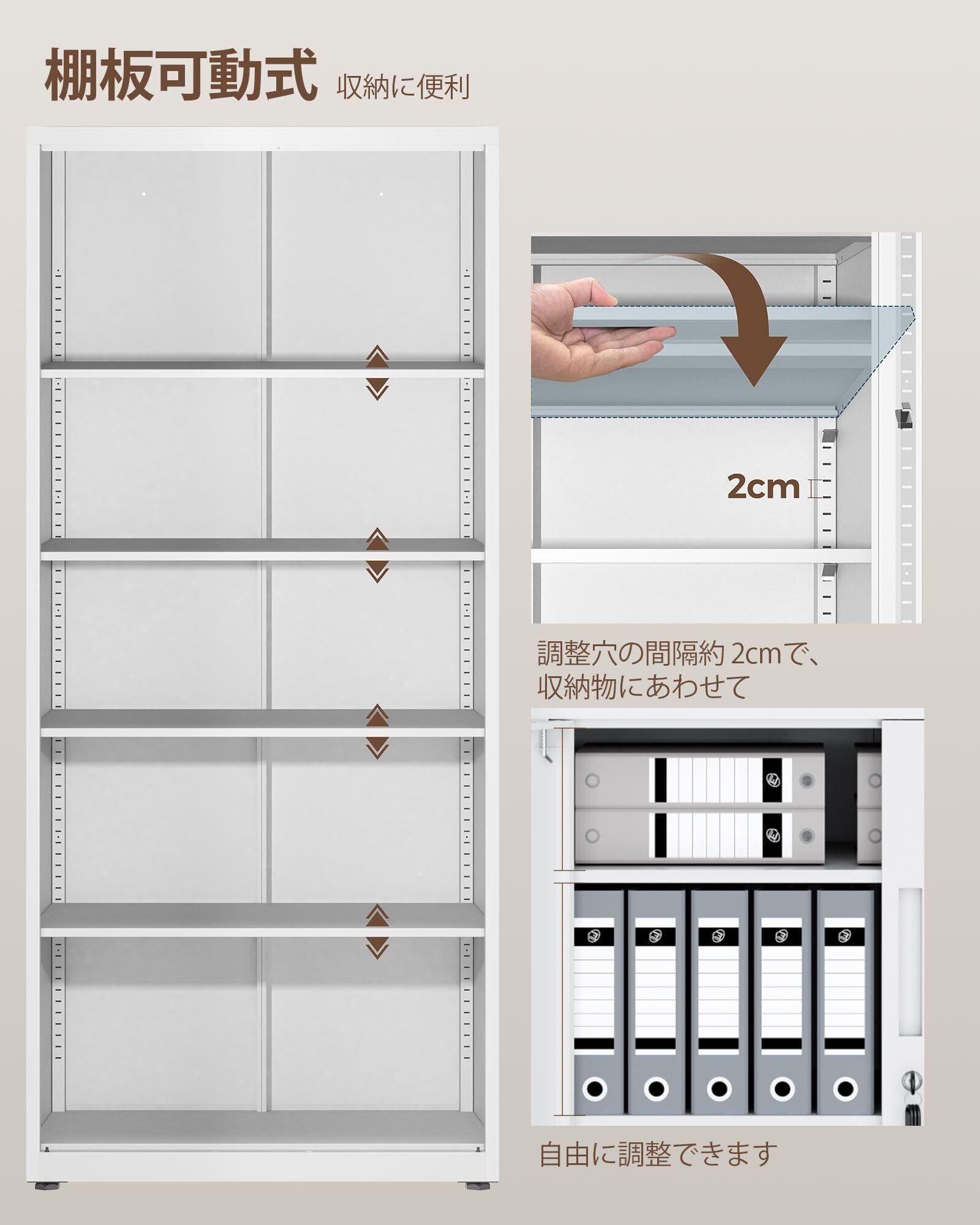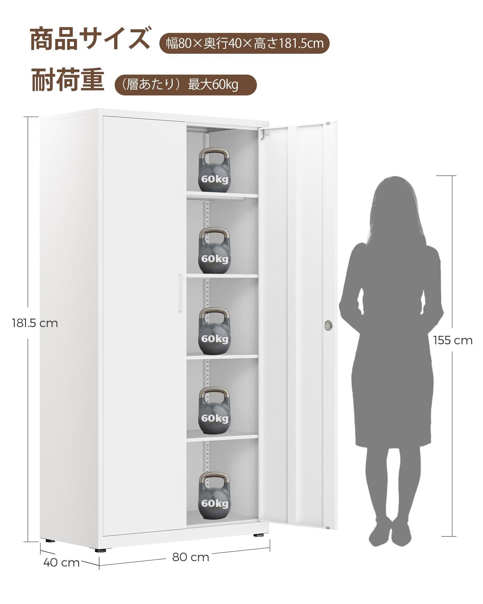 LAND·VOI スチールキャビネット 5段 鍵付き書庫 可動棚 両開き キャビネット収納 パントリー 幅80×奥行40×高さ181.5cm 組み立て必要 ホワイト