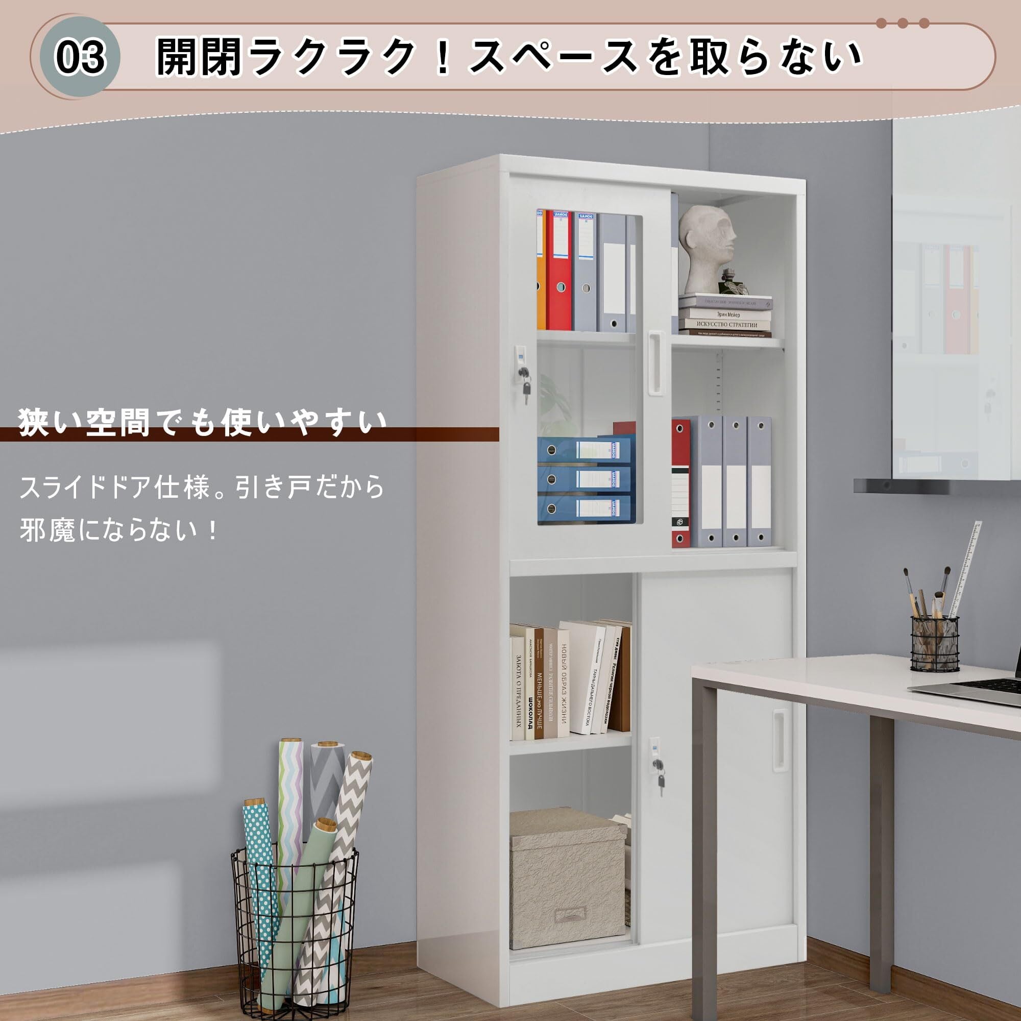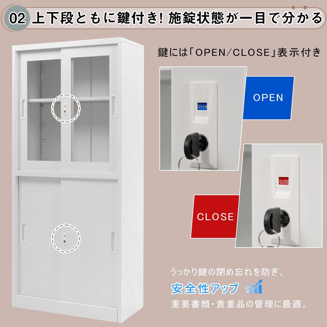 【新着商品】OSJ スチール書庫 引き戸タイプ 書類保管庫 上ガラス 下スチール 高さ180cm 保管庫 収納 オフィス 業務用 書庫 おしゃれ キャビネット ベース付き 可動棚 A4対応 | SmartLiving+
