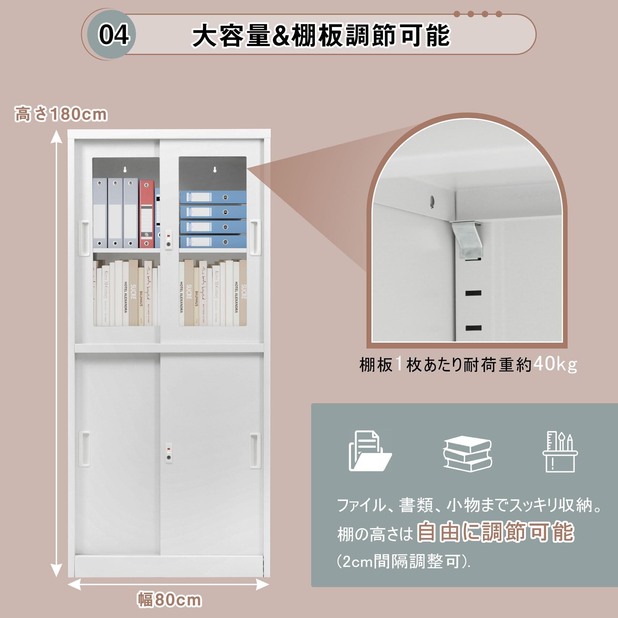 「A4ファイルもしっかり収納可能!」 A4サイズのファイルを横並びにしても、積み重ねても、余裕を持って収納できます。幅80cm、高さ180cmの広々としたスペースで、効率よく整理整頓ができ、使い勝手抜群です。