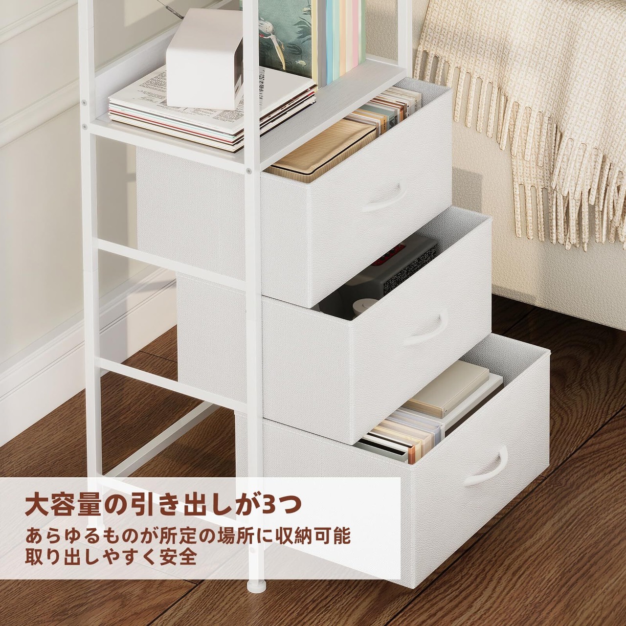 ■【便利な引き出し付き】本棚には便利な引き出しが3個付き。書類や小物をすっきりと整理できるため、散らかりがちなデスク周りもすっきり保てます。大切なアイテムをしっかり収納しながら、いつでも手に取りやすいデザインです✨。