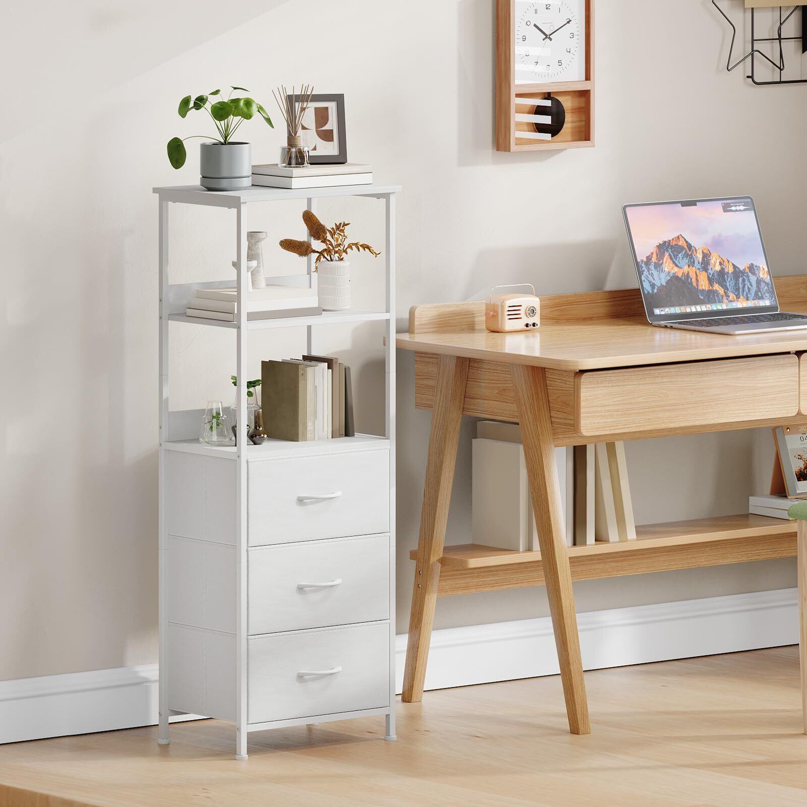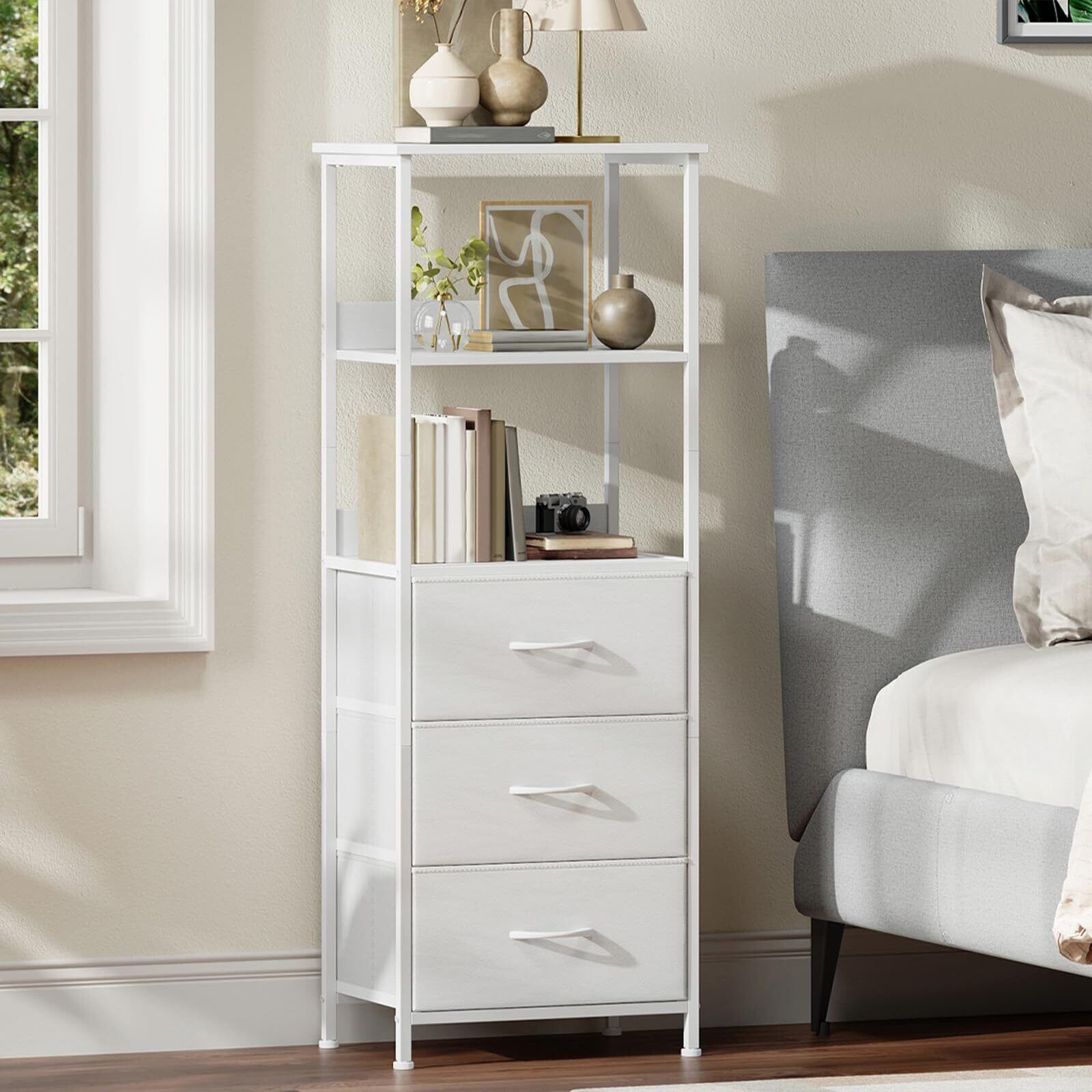 Somdot 縦型本棚 引き出し3個付き 本棚 棚付き 木製収納オーガナイザー キャビネット メタルフレームディスプレイ スタンディングシェルフユニット 寝室 キッチン オフィス用 ホワイト