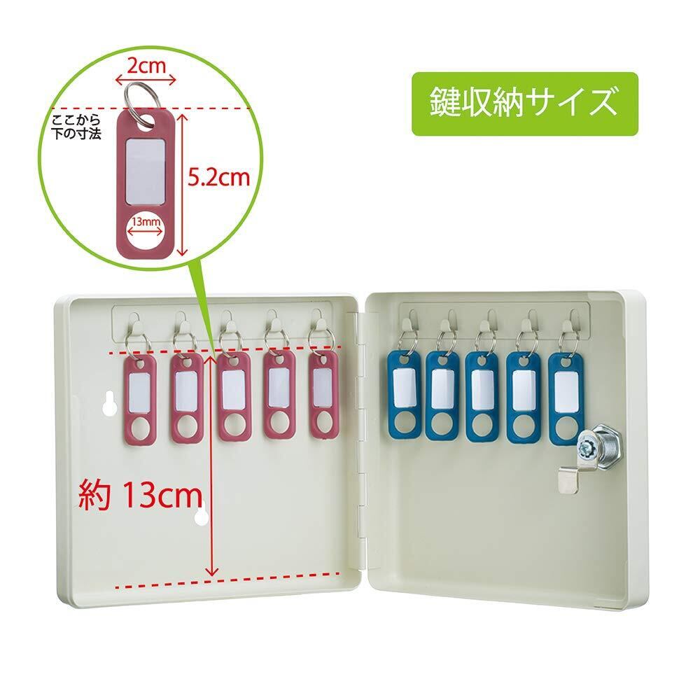●オフィスや倉庫などの鍵の管理に適したシリンダータイプのキーボックスです。●カラフルなキーホルダーで鍵を分類して管理可能です。●キーホルダーごとにネームシートが付いており、掛け間違いを防ぎます。●収容効率に優れたコンパクトサイズで、省スペースでの保管が可能です。●本体裏側に壁掛け用の穴があり、付属のねじとコンクリート用プラグを使うことで壁に取り付けられます。