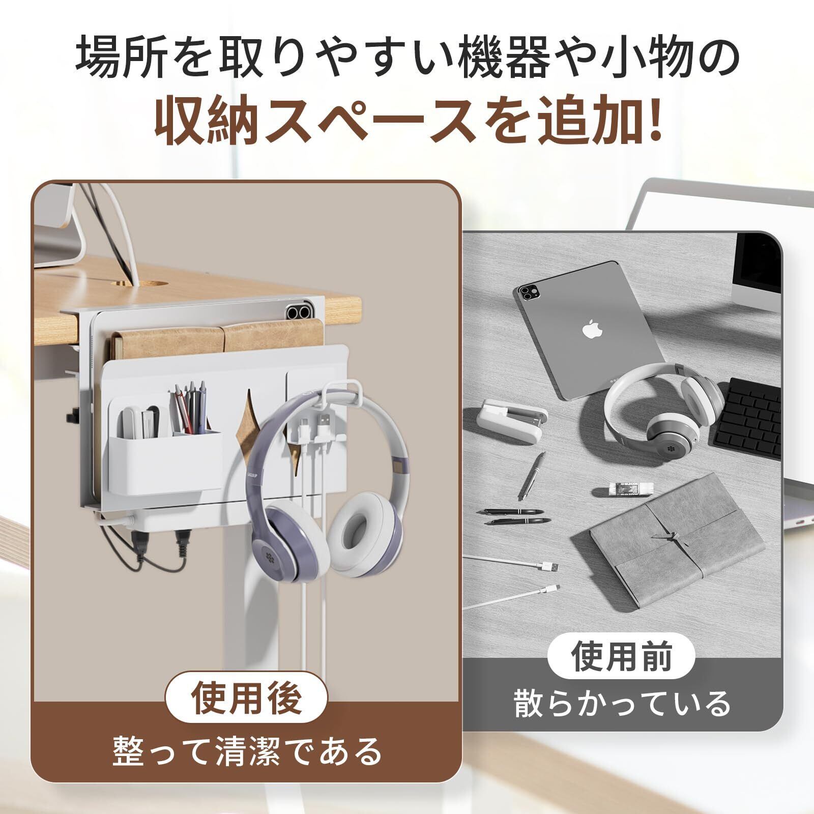 ■【省スペース設計で効率的な収納】穴あけ不要で、デスクサイドにぴったりフィット。タブレットや小物などをしっかり収納しつつ、場所を取りません。デスク周りをスマートに整え、快適な作業環境を実現します✨。
