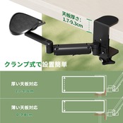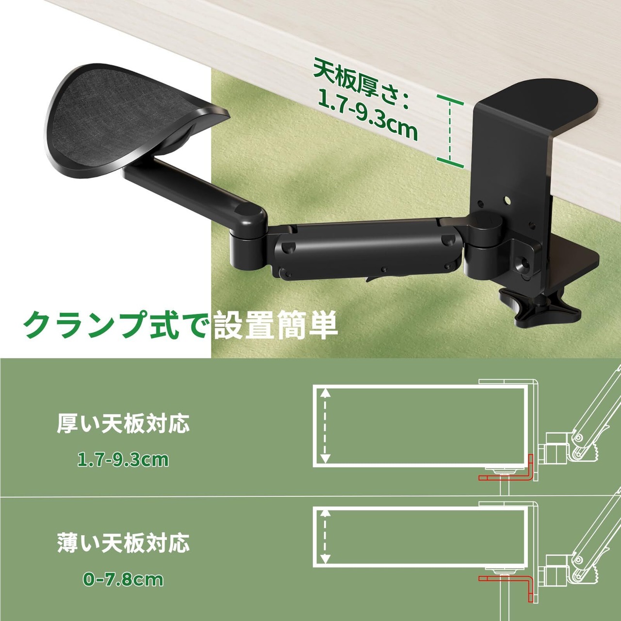 【かんたん設置】このブラックアームレスト組み立てる必要はありません。デスクの天板を上下から挟み込んで固定したら使えます。最厚9.3cmのクラス天板に適応可能 です。L字型金属ブロックは、異なる厚さのテーブル板に適応するために、正逆に取り付けることができます 。クランプには滑り止めのゴムパッドが付いており、安定性を高めながら、デスクの損傷を防ぐことができます