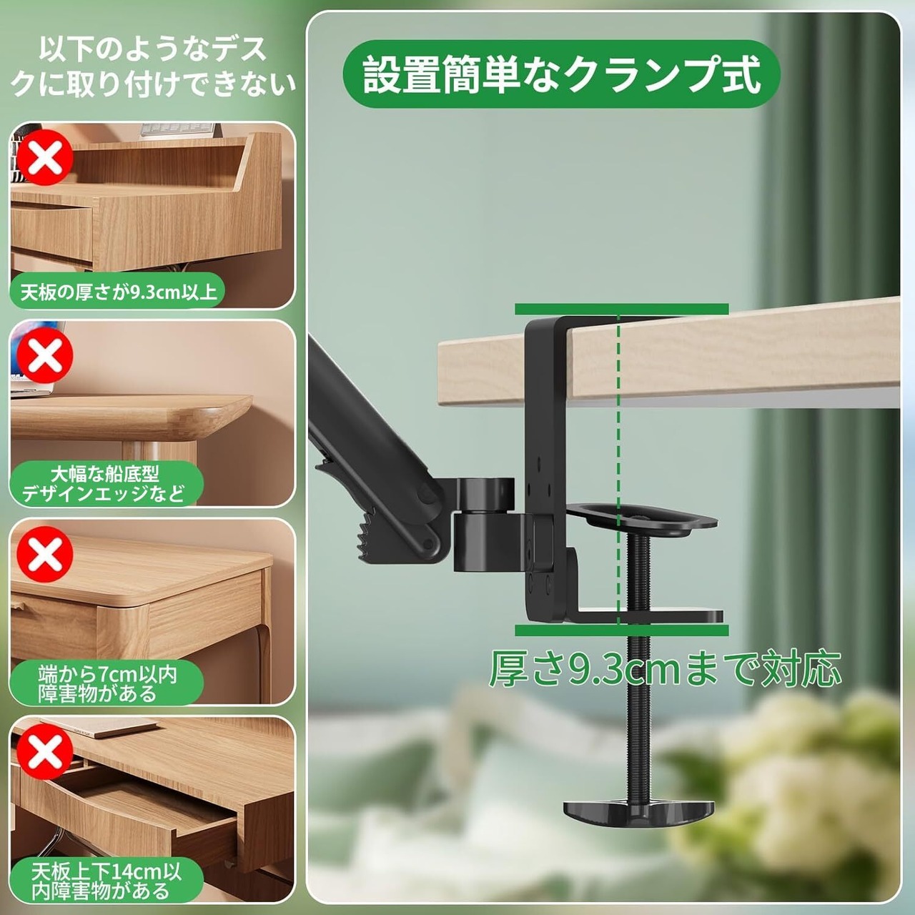【ご注意】アームレストをご使用の際、下記の場合にはご注意ください。1. 天板の厚さは9.3cmを超えた。2. デスクには大幅に傾斜したエッジがある場合。3. デスクの端から7cm以内に障害物がある場合。4. 天板の上下10cm以内に障害物がある場合