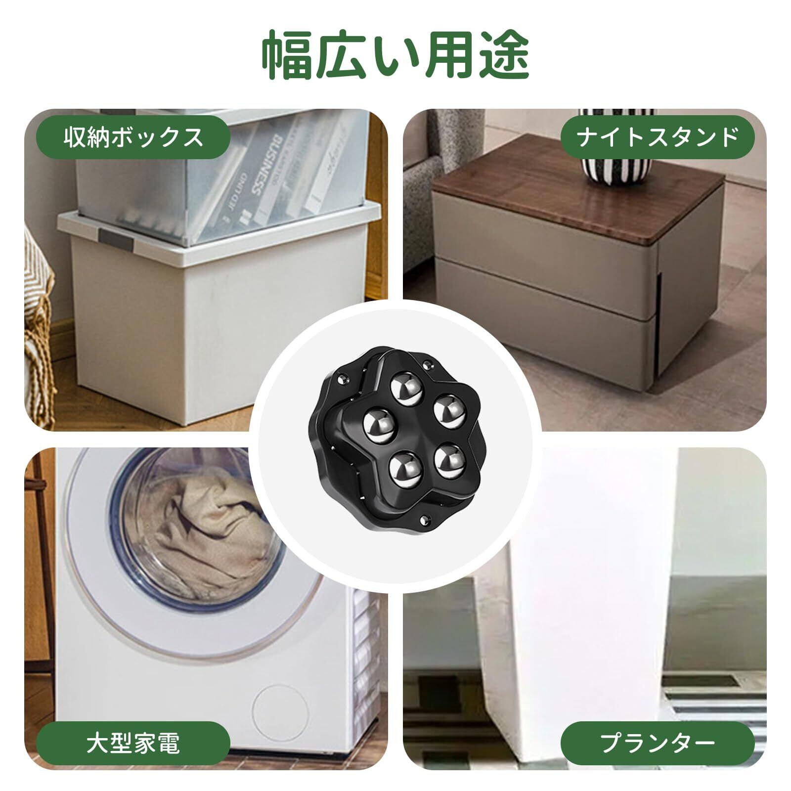【300kg強力な耐荷重】強化された金属鋼球素材で、洗濯機や冷蔵庫などの重量物を安定して支えます。衝撃に強い構造が歪み防止し、長期的な使用でも回転性能を維持します。