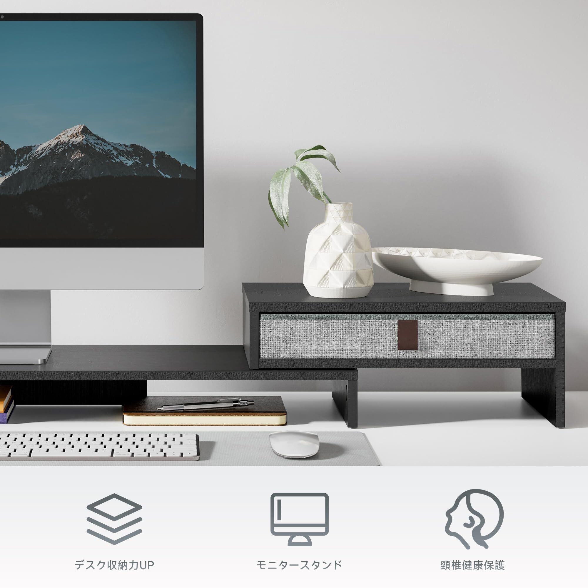 【収納たっぷり・ スペースを有効に活用】モニター台に引き出しが付いているのでペン、スマホ、ノートなどの文具小物一気に収納できます。モニター下の空間はキーボードやマウスなど周辺機器などの周辺機器を整理し、作業スペースが広めます。