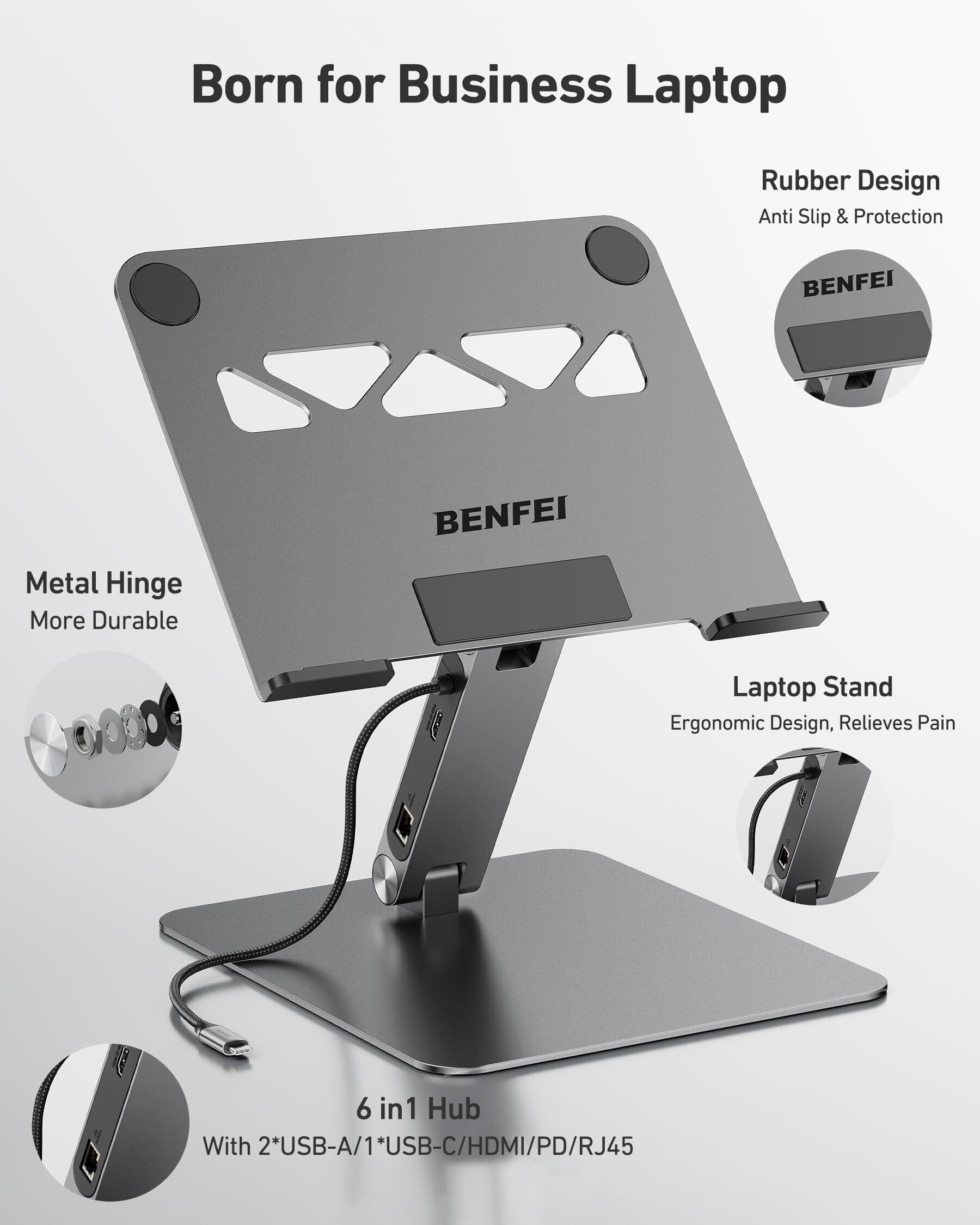 BENFEI ノートパソコンスタンド USB C 6in1 ドッキングステーション、HDMI 4K@60Hz、ギガビットイーサネット、100W 電源供給、10Gbps 1*USB C 3.2 および 2*USB A 3.2 MacBook Pro/Air、iPad Pro、XPS、Thinkpad と互換性あり