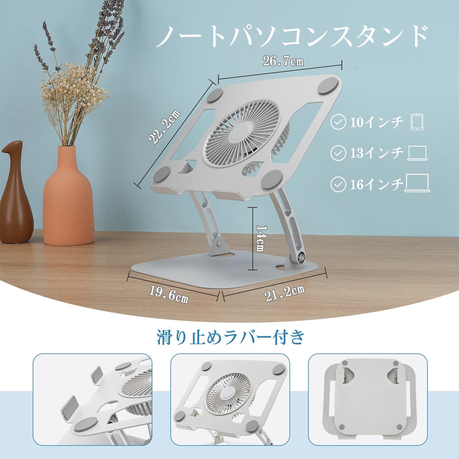 【対応機種と滑り止めラバー】最大16インチノートパソコン対応のpcスタンドで、幅広いデバイスに対応します。パソコンスタンドの爪の内側・表面・底部共に10個の滑り止めパッド付きで、デバイスとスタンドの安定性を高めます。これにより、パソコンとデスクの傷付きは心配がなく、安心して作業ができます。
