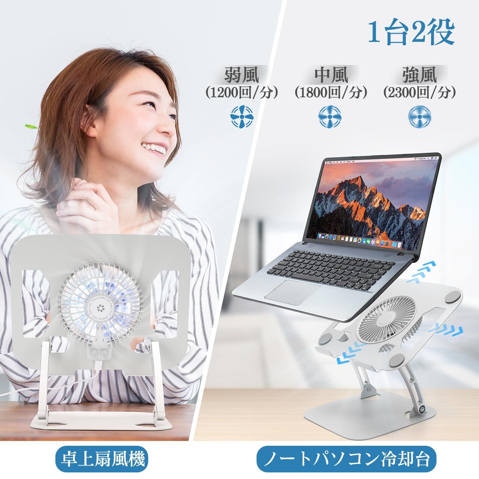 【大風量冷却ファンを搭載で1台2役】SHUWEIノートパソコン冷却スタンドは3段(1200rpm/1800rpm/2300rpm)の風量調整ができる冷却ファンを搭載され、ノートパソコン冷却台と卓上扇風機として使用できます。パソコンの過熱を防ぎながら、作業環境を涼しく快適に保ちます。さらに、放熱を助けることで、パソコンの性能を最大限に発揮させ、効率的な作業を実現します。