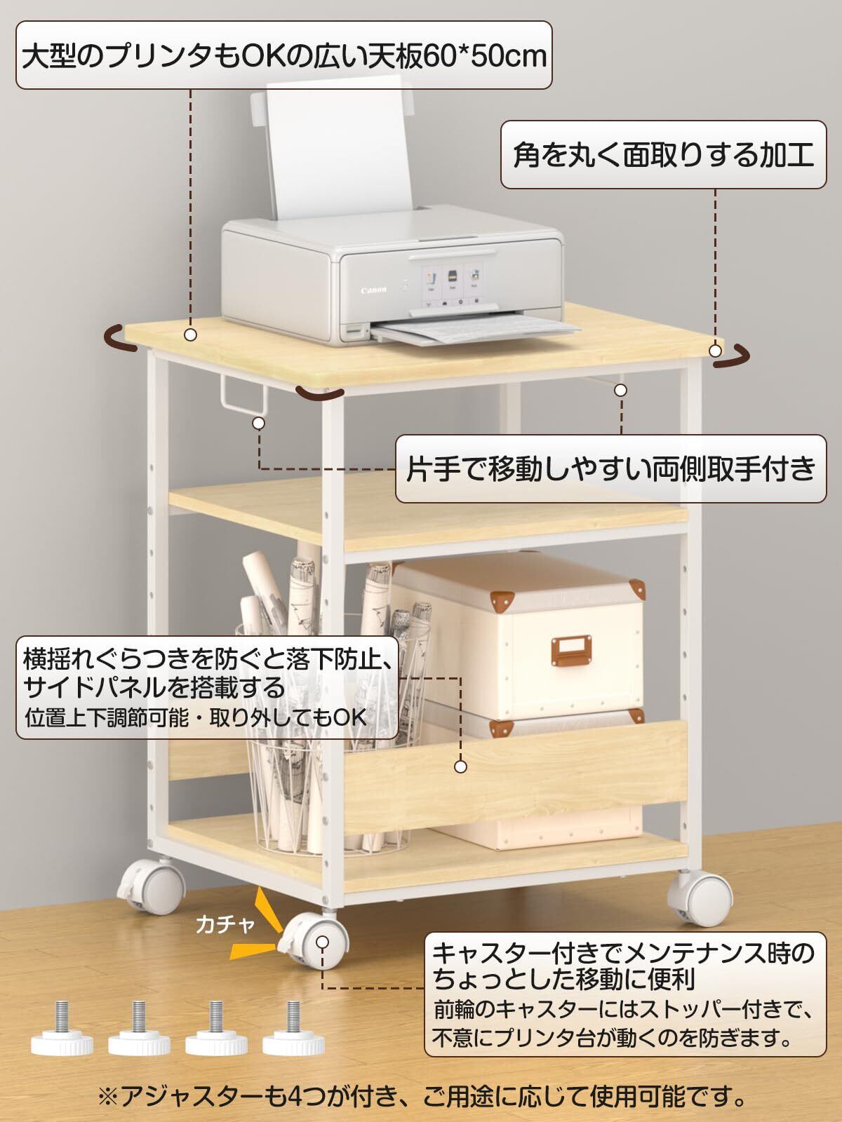 【人気商品】MIYOKI プリンター台 プリンタラック キャスター付き 幅60 奥行50cm 高さ70cm 総耐荷重90kg A3 A4対応 コピー機台 サイド デスク ワゴン デスク下 収納棚 事務用品収納 物置台 中棚9段階調節可能 組立簡単 (ナチュラル) | SmartLiving+