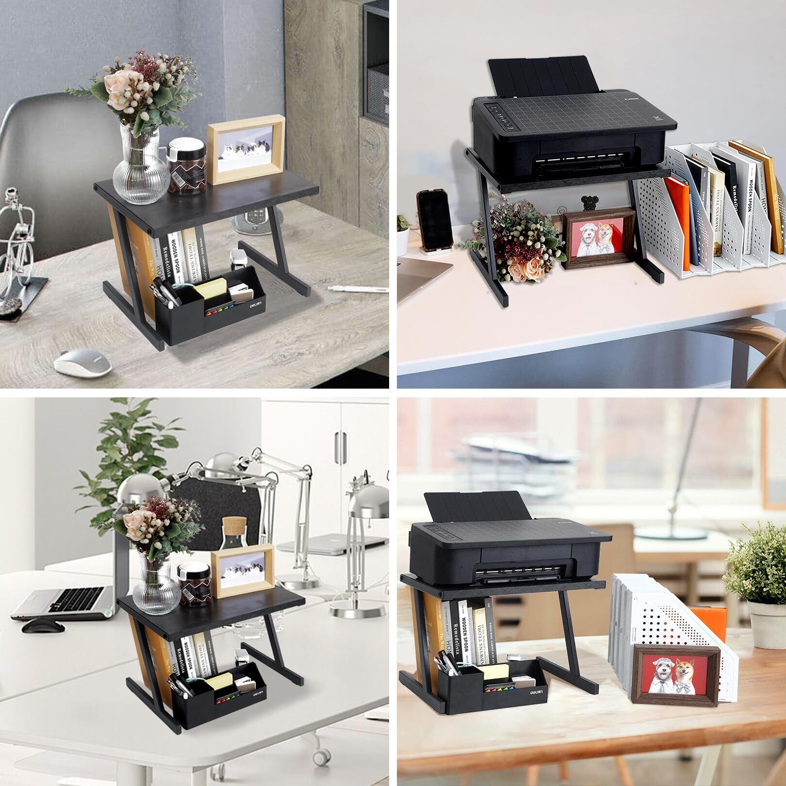 【収納力アップ・省スペース】2段式プリンターラックは、2段収納スペースがあるほか、棚板の下部分も活用できます。より多くの収納スペースを提供するだけでなく、デスクトップをより整然とさせることができます。プリンタ、ファイル、本、事務用品、すべてを整理します!