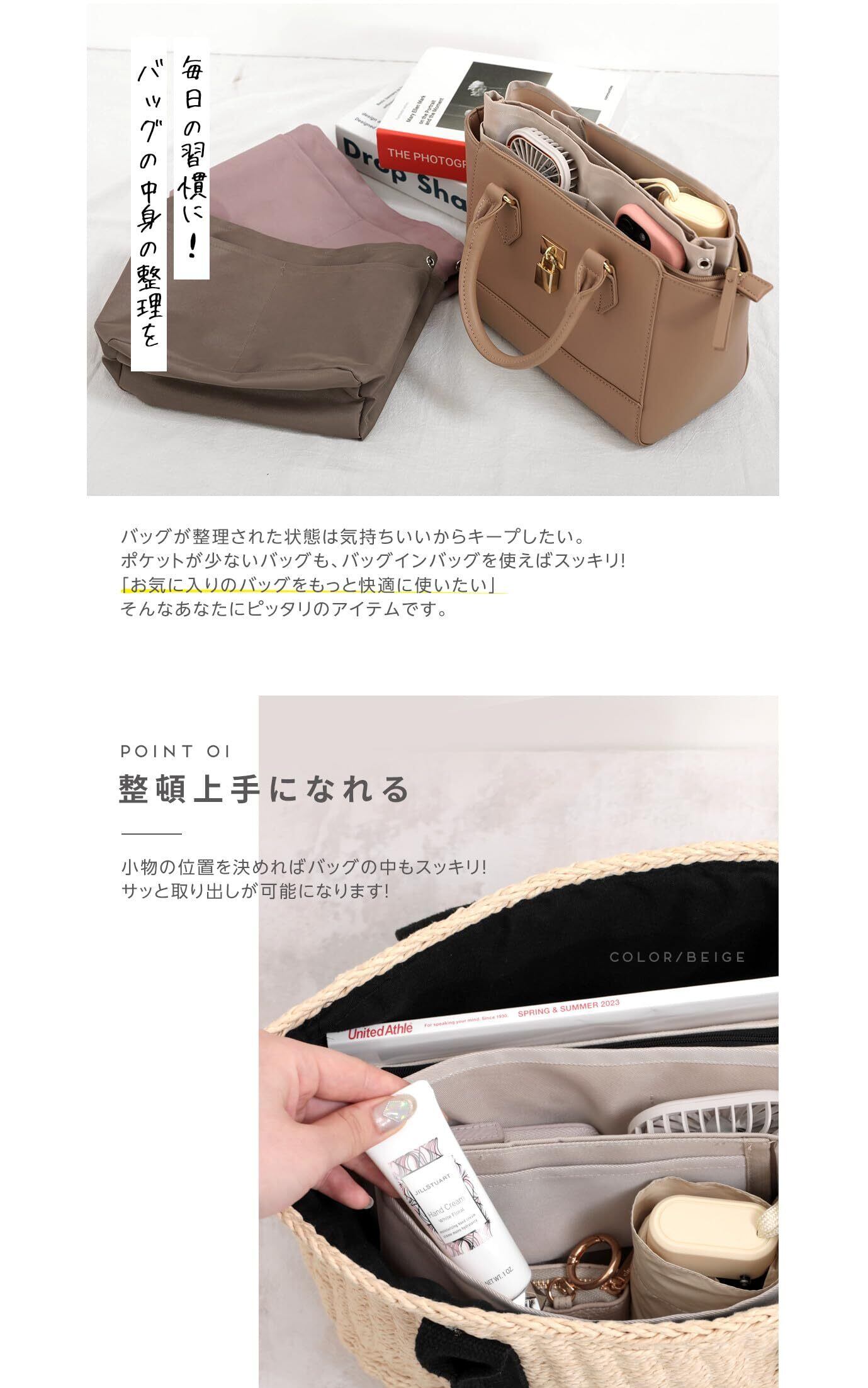 バッグインバッグ 小さめ インナーバッグ 縦型 【バックの中を簡単に整理整頓可能】 (ベージユ, Sサイズ)