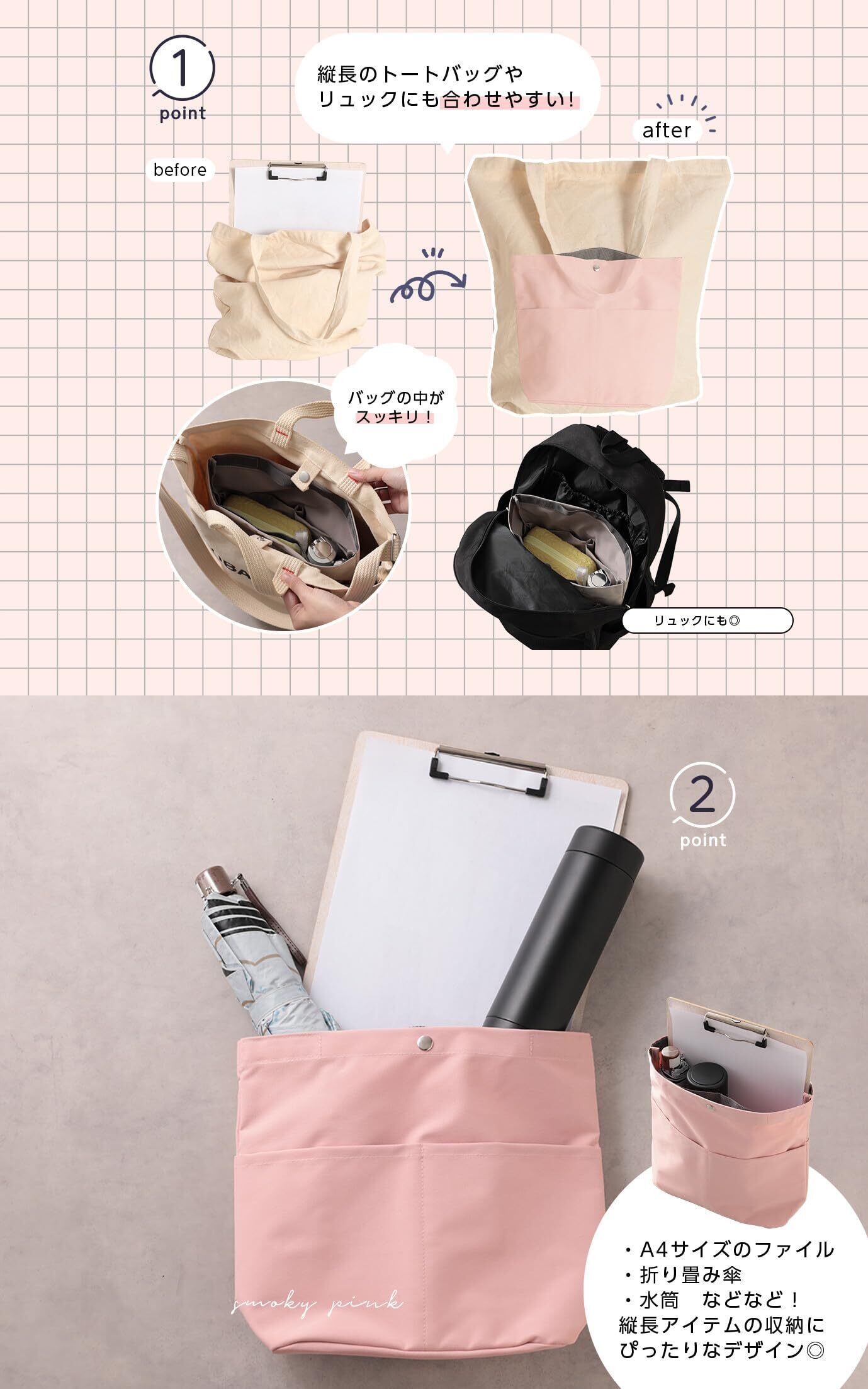 【縦型バッグインバッグでスマート収納】深型のデザインでバッグの中身をスッキリ整理。忙しい日常でも、必要なものをスムーズに取り出せます。スマートな女性の強い味方です。