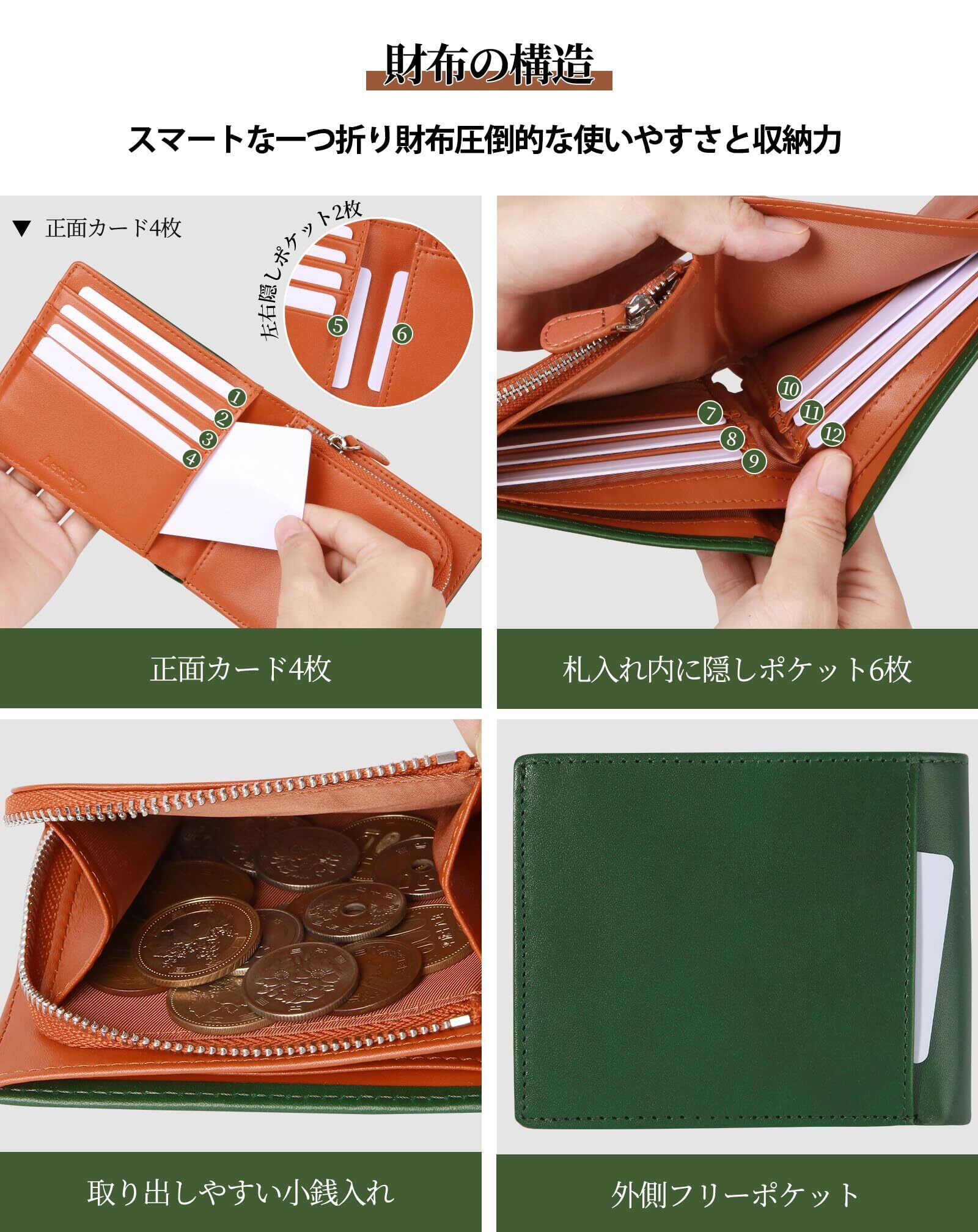 【商品仕様】:(素材 ):栃木 レザー;(カラー5色):ブラックx2、グリーン、ブラウン、コーヒー;(サイズ):たて11.8cm×よこ9.7cm×厚2.5cm;重さ:約100g(仕様):カード入れx12、札入れx2、外ポケットx1(ICカード対応)、L字型ファスナー小銭入れ× 1(コイン出し入れ簡単)。開いたときにパッと見渡せる。さらに、カードもお札も取り出しやすい構造になっています。