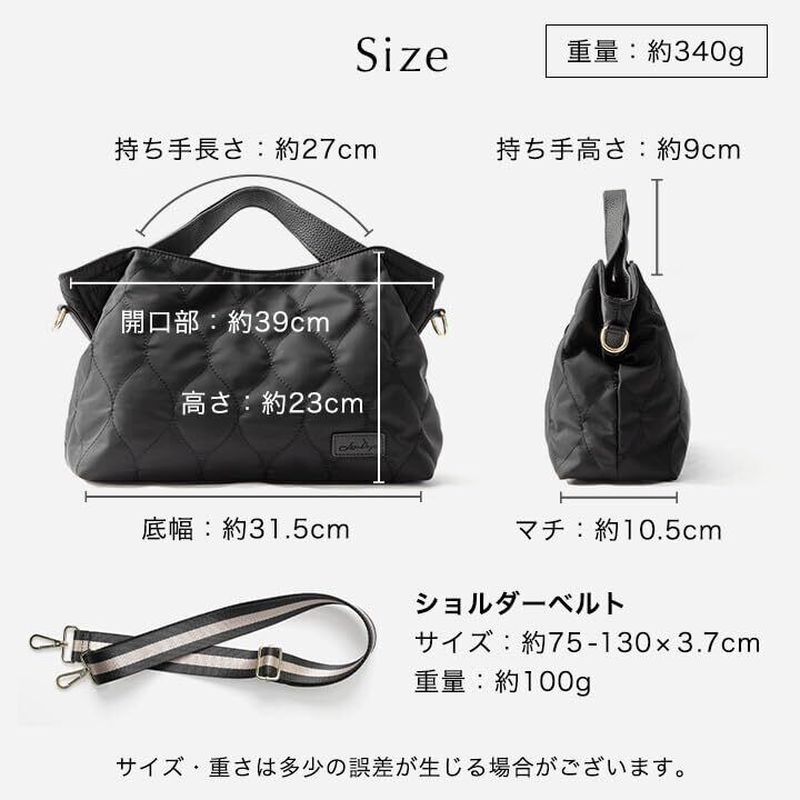 【サイズ(cm)】 開口幅:約39、底幅:約31.5、高さ:約23、マチ:約10.5、持ち手高:約9、持ち手長さ:約27 ショルダー長さ×幅:約75-130×3.7 【重量(g)】 [本体]約340 [ショルダー]約100