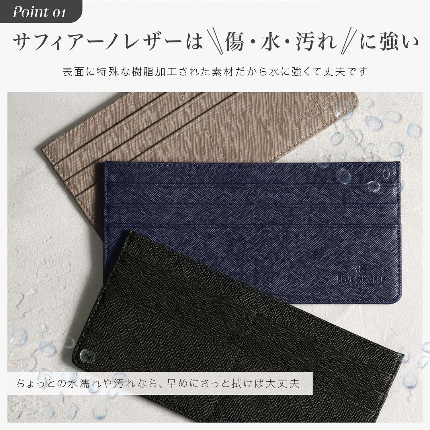 【 薄さ × 収納力 】 「最近流行りのミニバッグに収納できる薄さが欲しい」「薄くて、しっかりお札や小銭も入る財布を探している」そんなお声から、薄さと収納力を兼ね備えた薄型長財布がBLUE SINCEREから登場しました。 薄さは業界最高峰の ”0.5㎜” を実現。収納力は、カード6枚に加え、お札や小銭もたっぷり収納することができます。 週末のデートや1泊2日の旅行から、フォーマルシーンなどいろんな場面でお使い頂くことができます。 薄さと収納力を持った財布をお探しのあなたにピッタリな薄型長財布です。