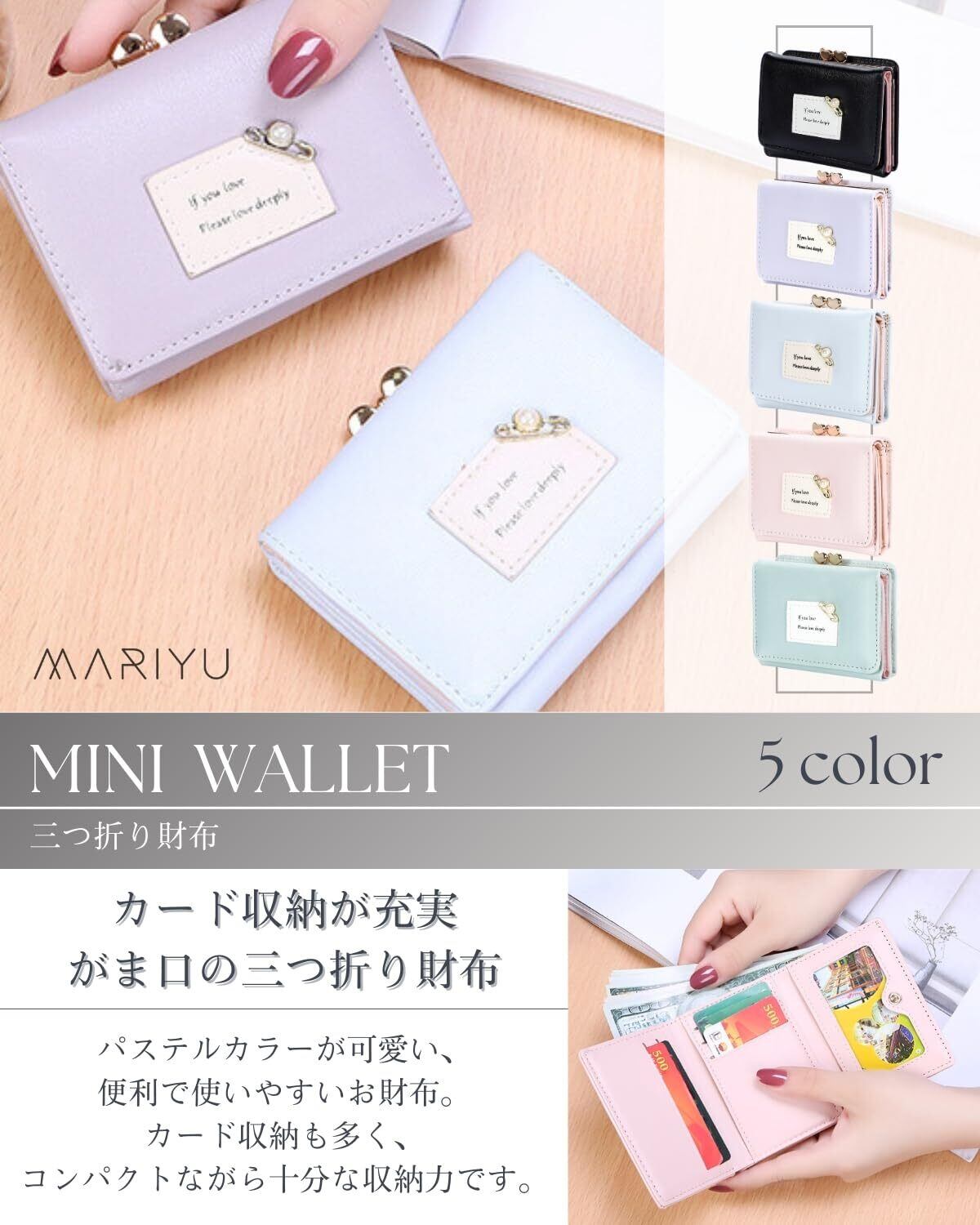■【トレンド感満載の可愛いデザイン!】「MARIYU」のミニ財布は、明るいライトグリーンが目を引くデザインで、女の子のファッションアイテムとして最適です。三つ折りのがまぐちスタイルで可愛らしさと機能性を両立しています!✨