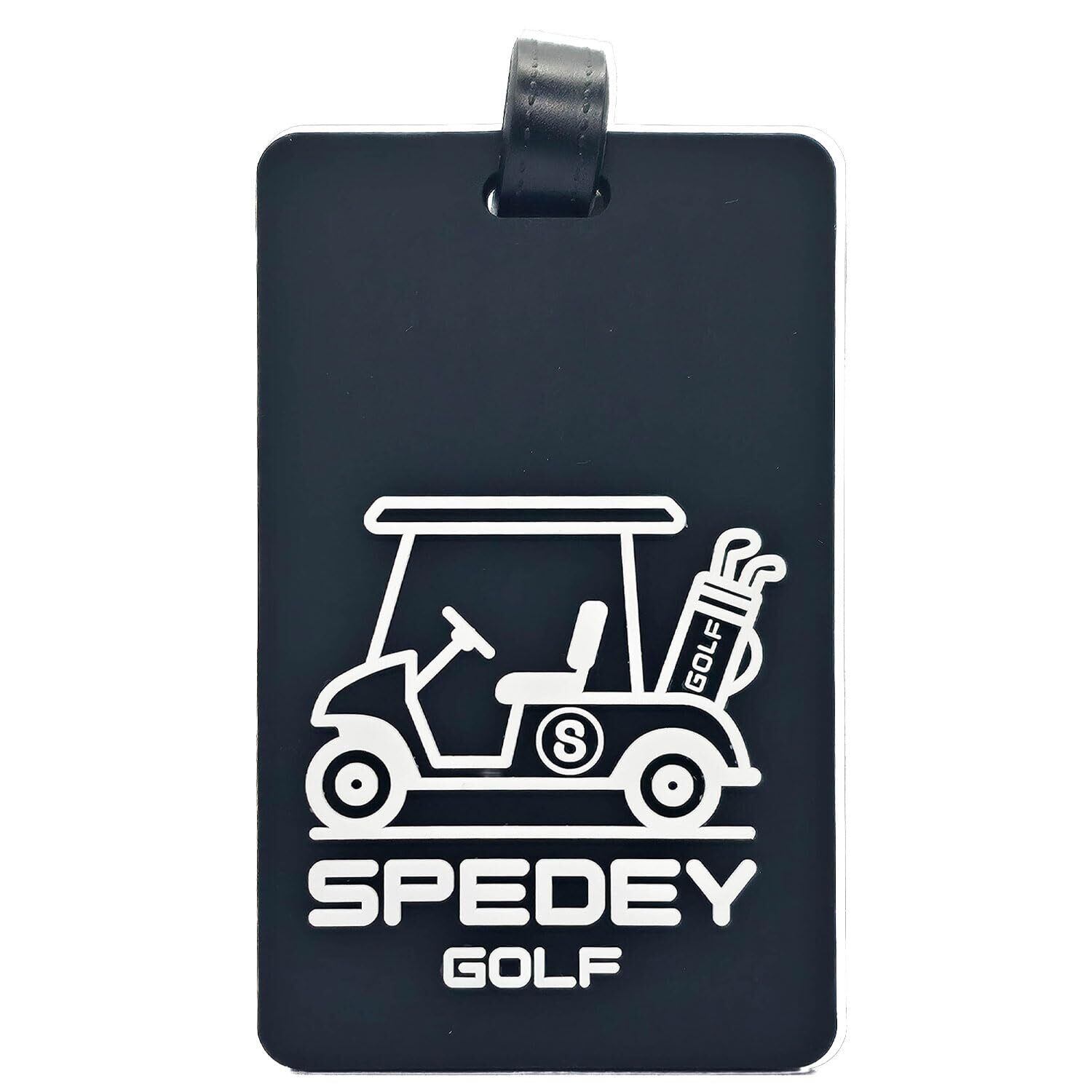 デザイン性: ゴルフカートのロゴが特徴的なSPEDEY GOLFのネームタグ。シンプルでスタイリッシュな黒地に白のデザインを採用