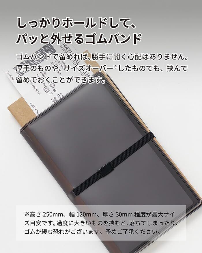 しっかりホールドして、パッと外せるゴムバンド。ゴムバンドで留めれば、勝手に開く心配はありません。厚手のものや、サイズオーバー※したものでも、挟んで留めておくことが出来ます。※最大サイズ目安:高さ250mm×幅120mm×厚さ30mm程度。過度に大きいものを挟むと、落ちてしまったり、ゴムが緩む恐れがございます。予めご了承ください。