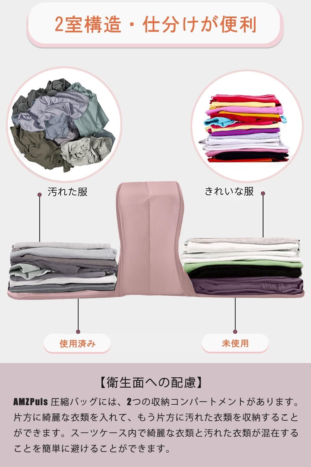 【衛生面への配慮 & 2Way スペース】AMZPuls 圧縮バッグには、2つの収納コンパートメントがあります。片方に綺麗な衣類を入れて、もう片方に汚れた衣類を収納することができます。スーツケース内で綺麗な衣類と汚れた衣類が混在することを簡単に避けることができます。ナイロン素材だからビニール製の圧縮バッグのように中身が見える心配がありません。ふいにキャリーケースを開ける場面でも安心です。