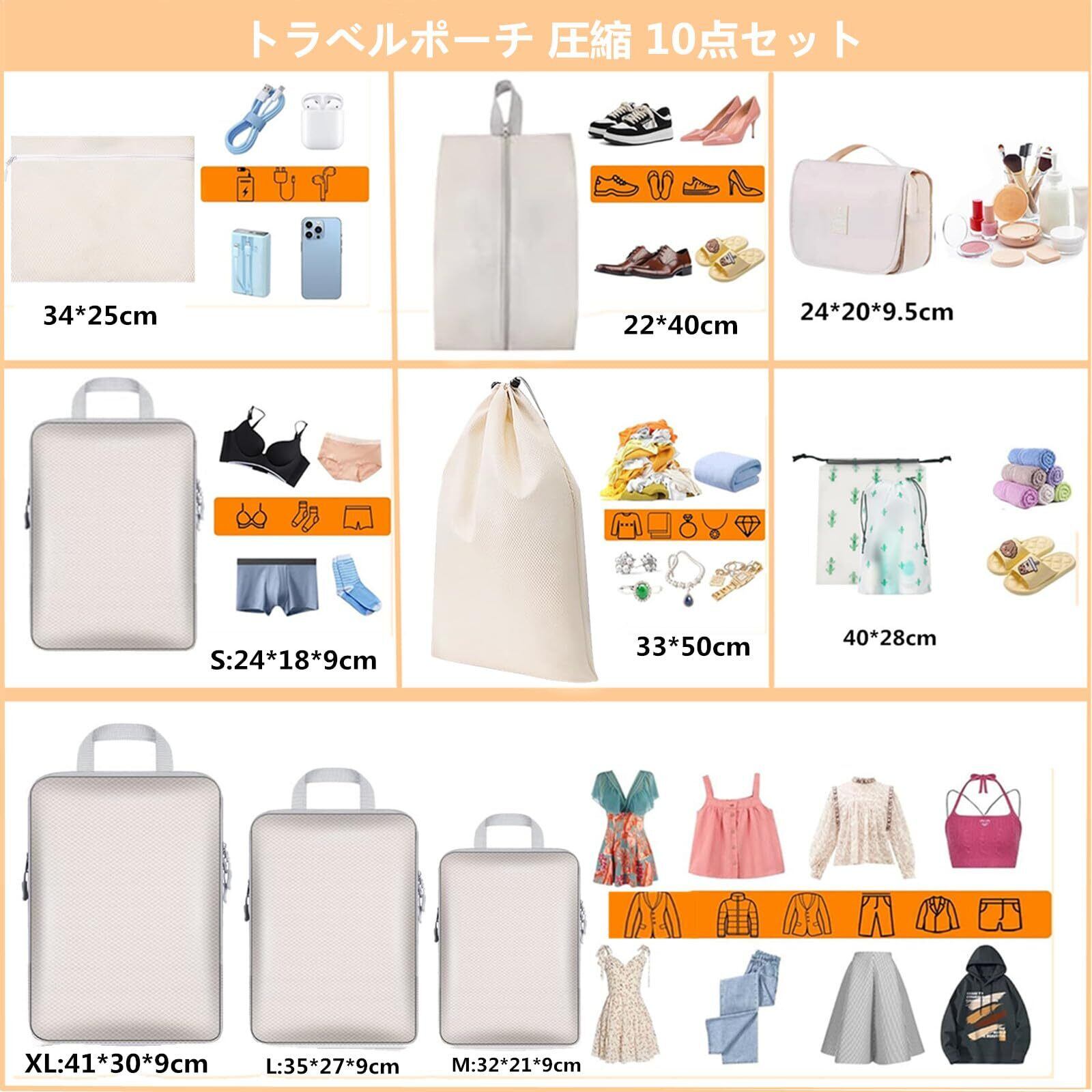 トラベルポーチ 圧縮 セット 旅行用圧縮袋 10点セット 【2025年最新型】 旅行圧縮バッグ パッキングポーチ 可変スペース 圧縮で衣類スペース約60%節約 圧縮ポーチ 洗面用具 旅行用 出張 衣類 整理 便利グッズ 靴用 下着収納 小物入れ (ベージュ)